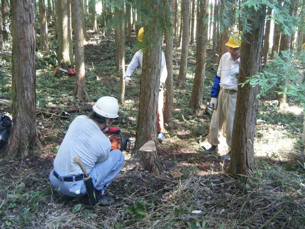 研修では4~5名が1班になり、それぞれ宮川森林組合の職員からチェーンソーのメンテナンス方法やチェーンの目立てのコツなどの講義を受けた後、実際にヒノキ林に入って伐倒の実習を行いました。