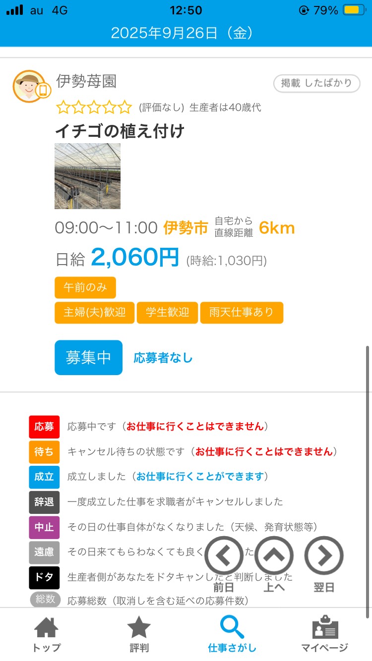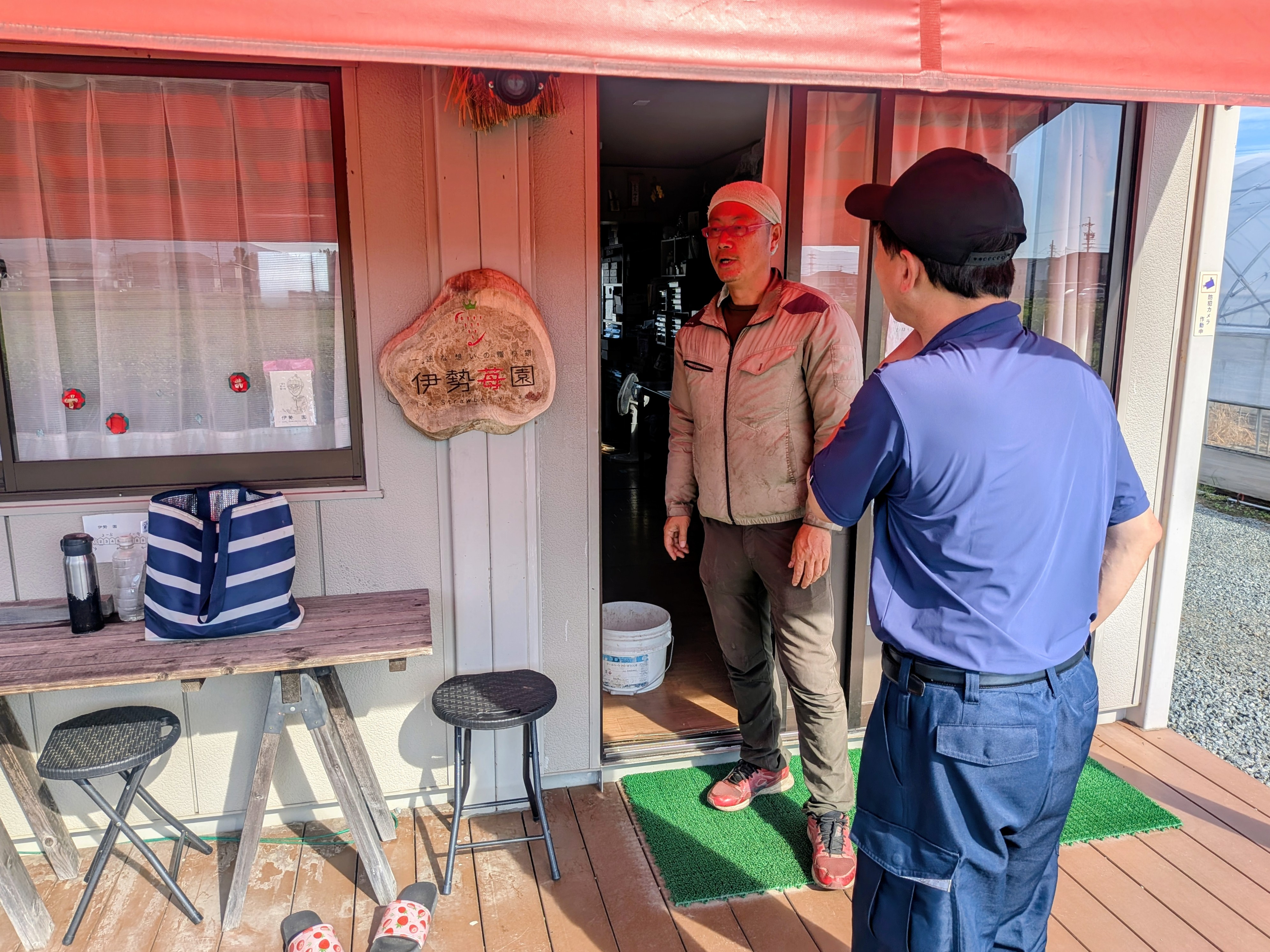 鮮やかなイチゴの絵が目印の「伊勢苺園」。21棟のハウスを所有し、年間で約1t、およそ100万粒のイチゴを生産・出荷する伊勢市内で最も大きなイチゴ農家です。最盛期には1日で1万粒(1000パック)を出荷しているほか、イチゴ狩りや24時間イチゴを購入できる自動販売機を目当てに、年間1万人以上の人が来園します。農繁期には10名以上のパート・アルバイトを雇っているものの、それでも接客と農作業の両立は難しく、「今の人員だと、これぐらいの規模が限界ですね」と代表の倉野さんは話します。これからを見据えた新しい人材募集のカタチとして、今回活用したのがアプリ「デイワーク」です。倉野さんは農園の片隅でアプリを操作しながら「記入例を参考にすれば、意外と簡単に登録できるね」と5分もかからずに求人登録を終えました。