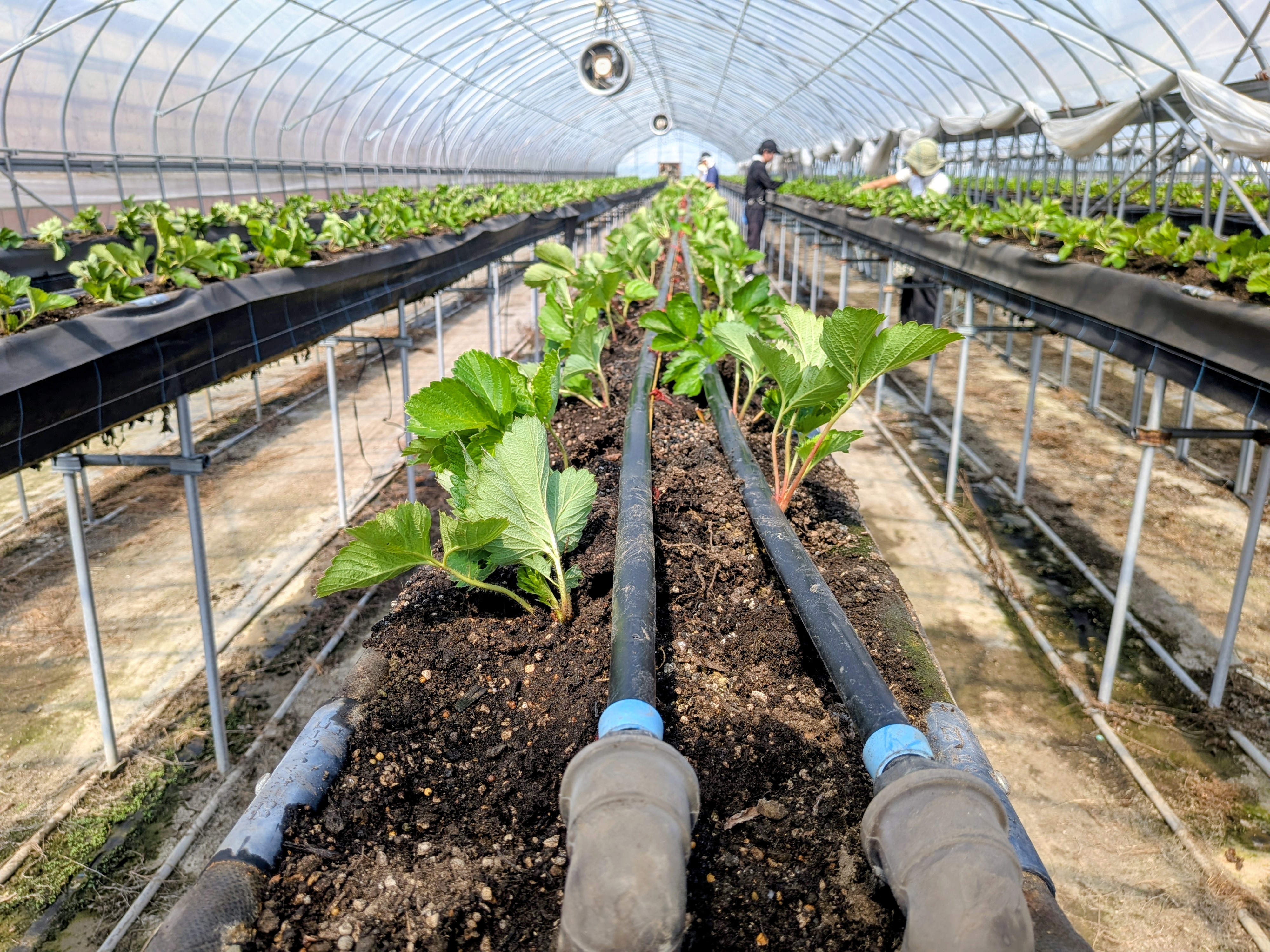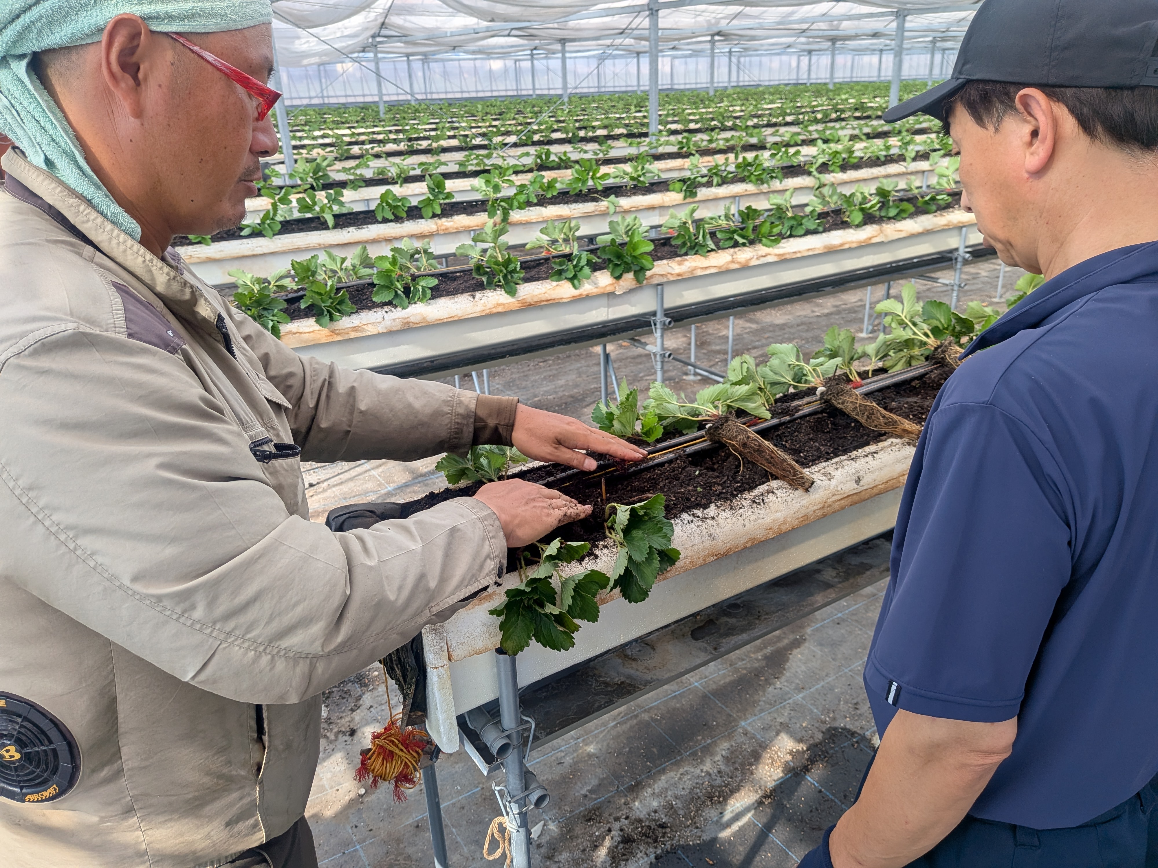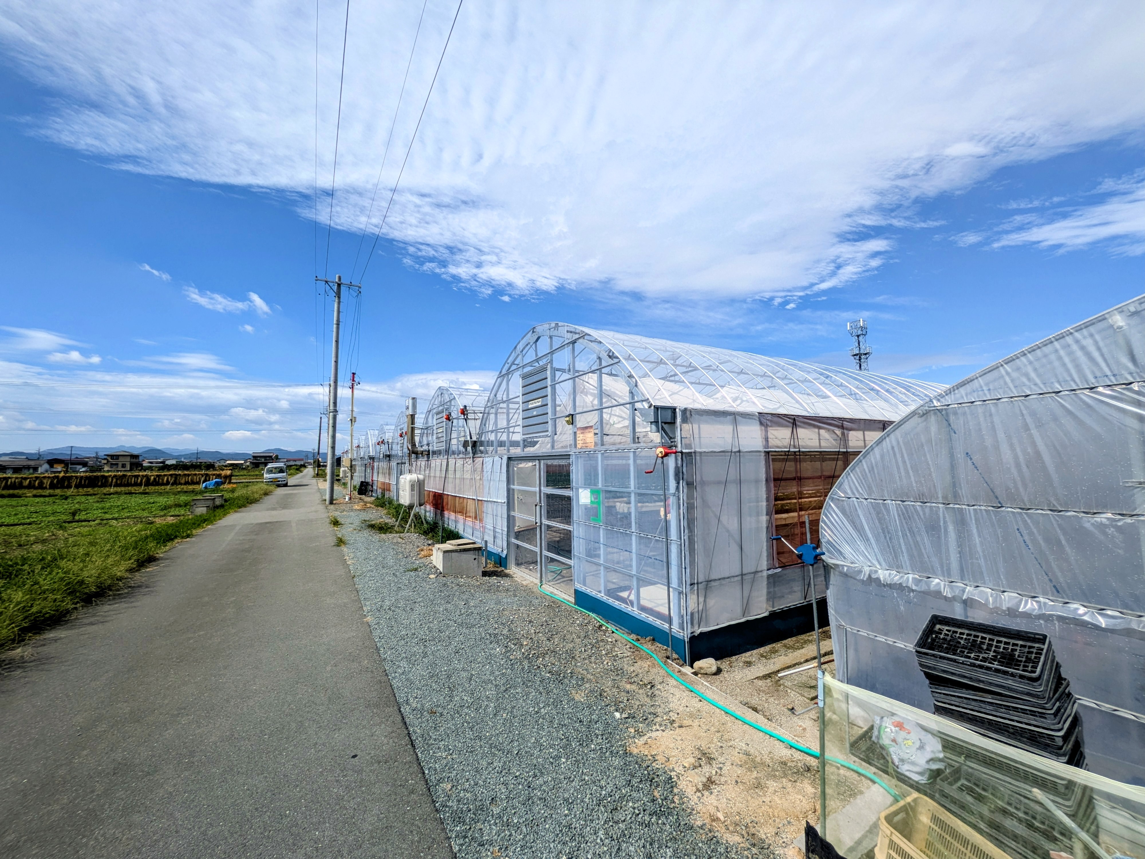 今回、作業に応募してくれたのは、近隣の運送会社に勤務する大西さんです。応募のきっかけを伺うと、「普段、野菜や果物の運送で農家さんと接する機会があり、せっかくなので自分も何かしらの形で農業に携わりたいと思いまして」とのこと。ちなみに大西さんはこれまで農業の経験は無く、今回が初めての挑戦となります。予定時刻の10分前に農場に到着した大西さんを、倉野さんが出迎えます。作業時間や報酬、熱中症対策など一通りの説明を終えた後、倉野さんの誘導で実際に作業するハウスに向かいます。今回の作業は「イチゴの定植作業」。ポットや育苗トレイの中で大きくなった苗を、一つひとつ植え替えていく作業です。