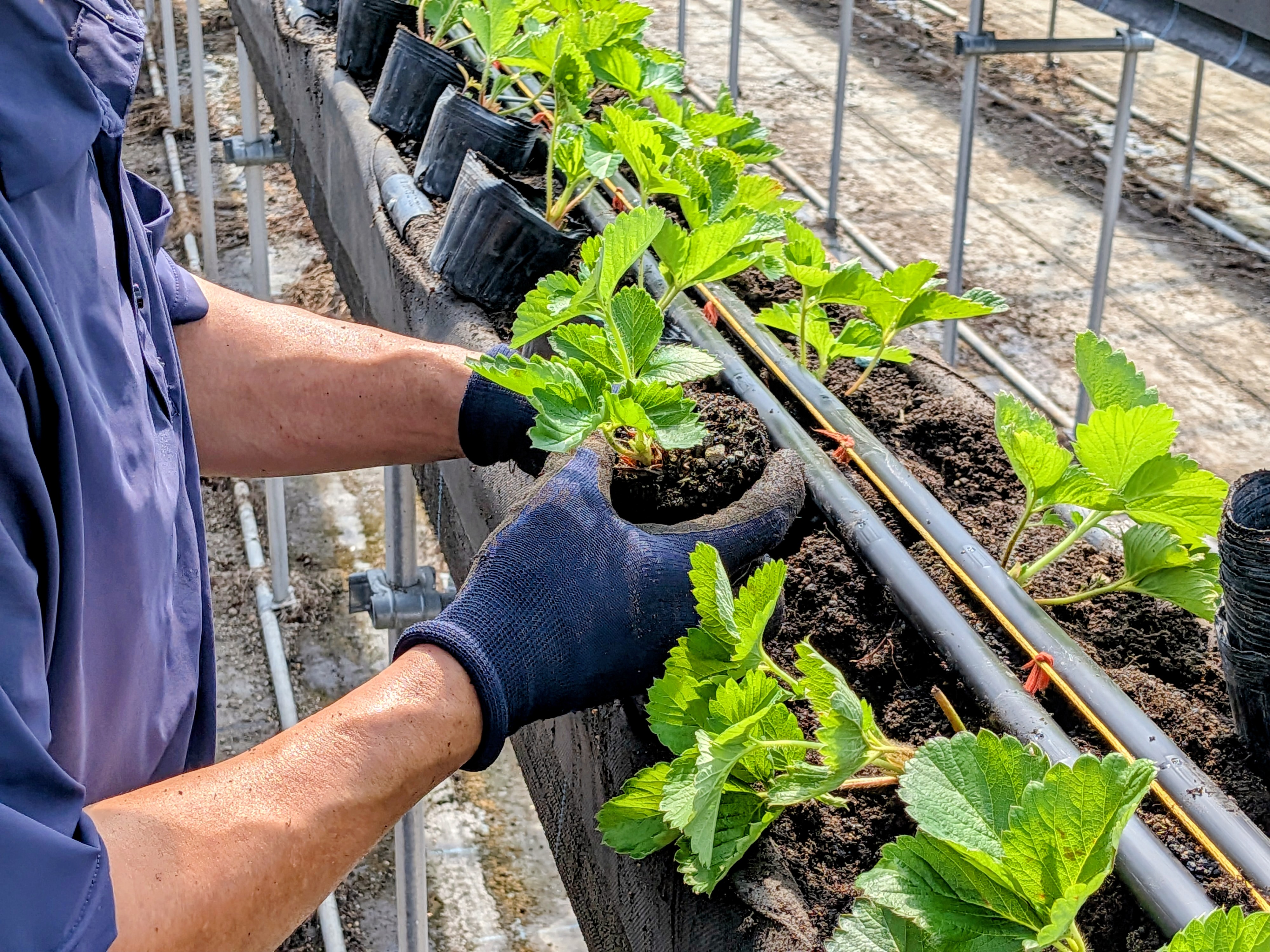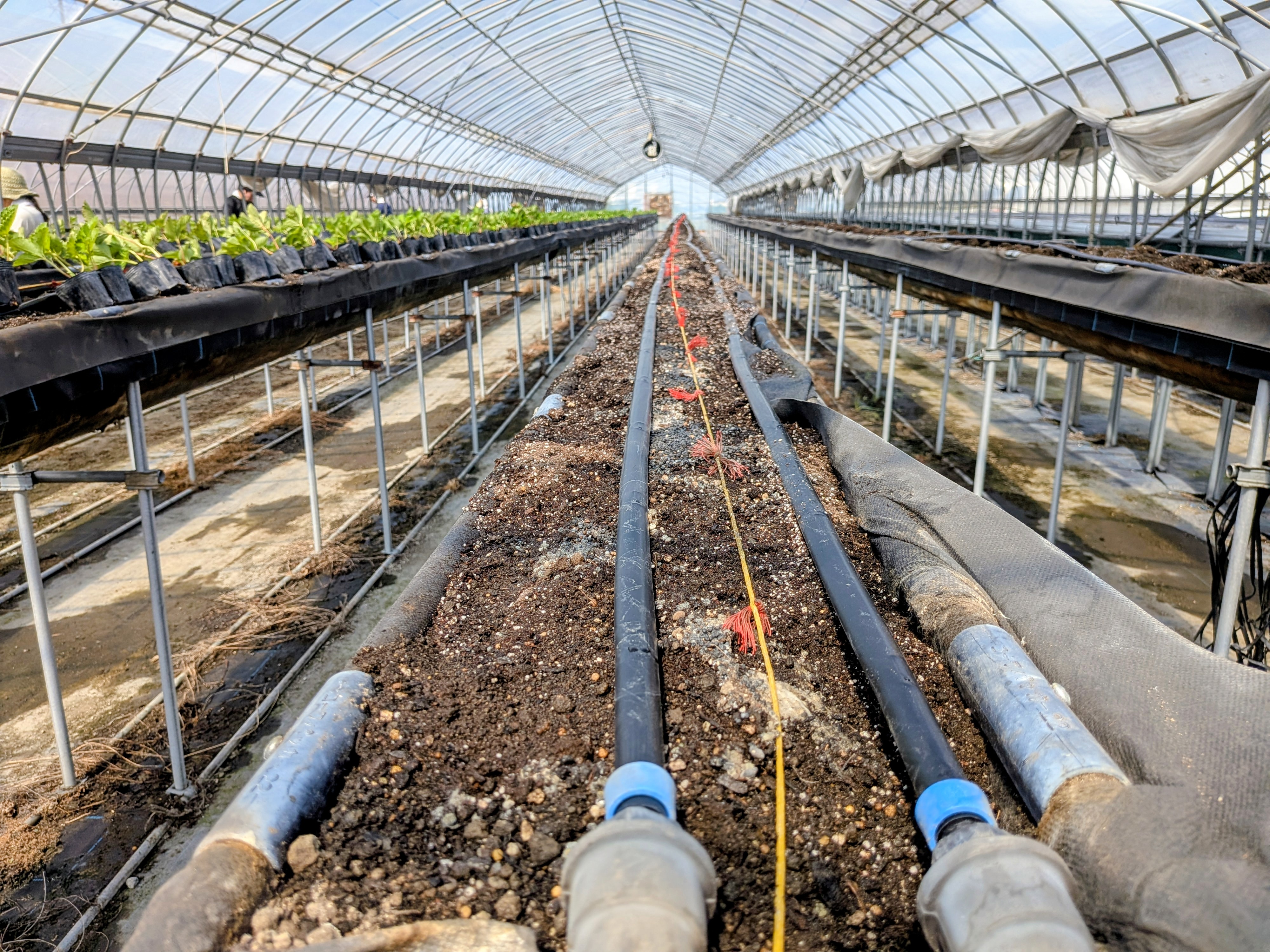 「葉が通路側を向くように、やや斜めに植えること」、「クラウン(葉の付け根の太い部分)が土から出る程度に植え付けること」など、実際に倉野さんが手本を見せながら作業のポイントを解説します。そして、働き手の大西さんが実際にいくつか定植を行い、問題なく植えられていることを確認したら、いよいよ作業開始となります。