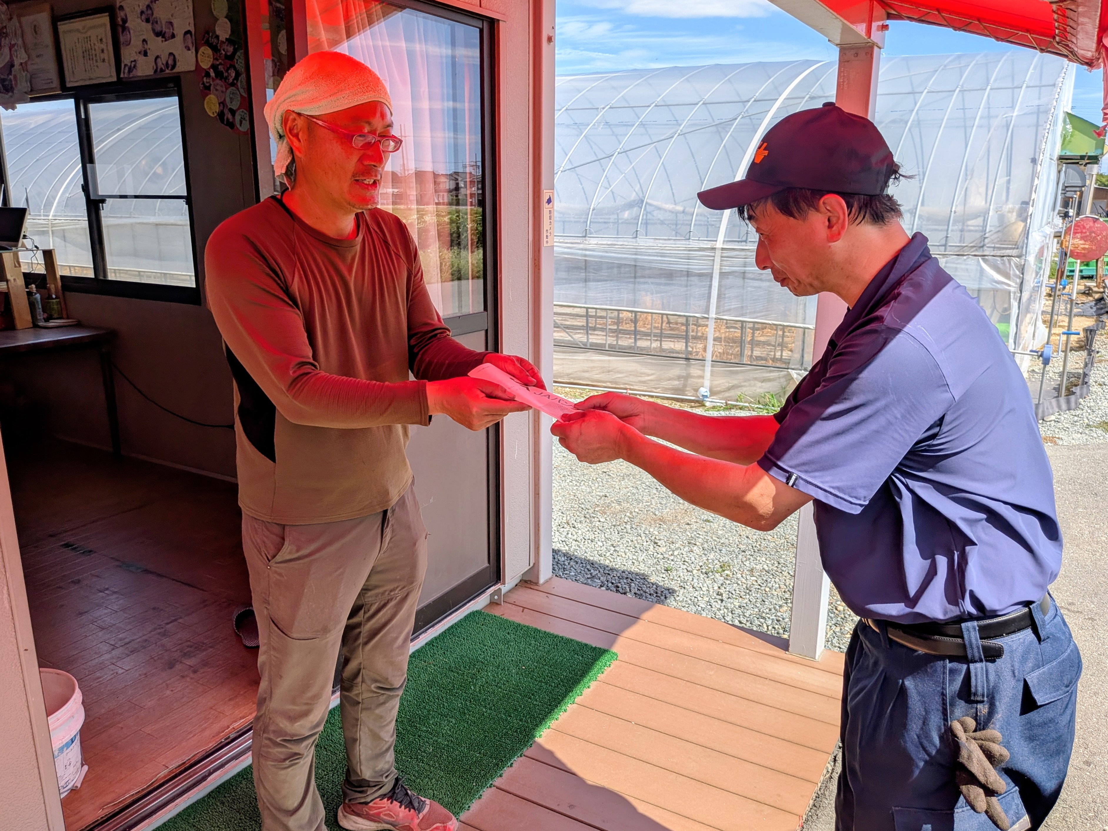 午前11時、終了時刻となり本日の給与が支払われます。倉野さんは「9月下旬とは思えない暑さで大変でしたが、来ていただいて助かりました。ぜひまた機会があればよろしくお願いします」と声を掛けました。大西さんも「自分に出来るか不安でしたが、何とかお役に立てて安心しています。普段何気なく食べている果物に、これだけの手間と苦労がかけられているのだと知れて、とても貴重な経験になりました」と感想を口にしました。大西さんを見送った後、今回初めてデイワークを使用した感想を倉野さんに伺うと、「基本的には初めて来たアルバイトの方を指導するのと変わりませんので、デイワークだからといって特別大変なことはありませんでした。ただ、自身で考えて別の仕事を行うのは難しいので、大西さんが常に定植の作業を続けられるよう、全体の業務の段取りには注意を払いました」と話しました。加えて「今回は普段運送業で働いている方でしたが、このように様々な業種の方が来ていただくことは、当社にとっても新しいヒントが得られるきっかけになるかもしれません。ITや広告に強い方に来ていただくのも面白いかもしれませんね」と今後の展開への希望も語っていただきました。