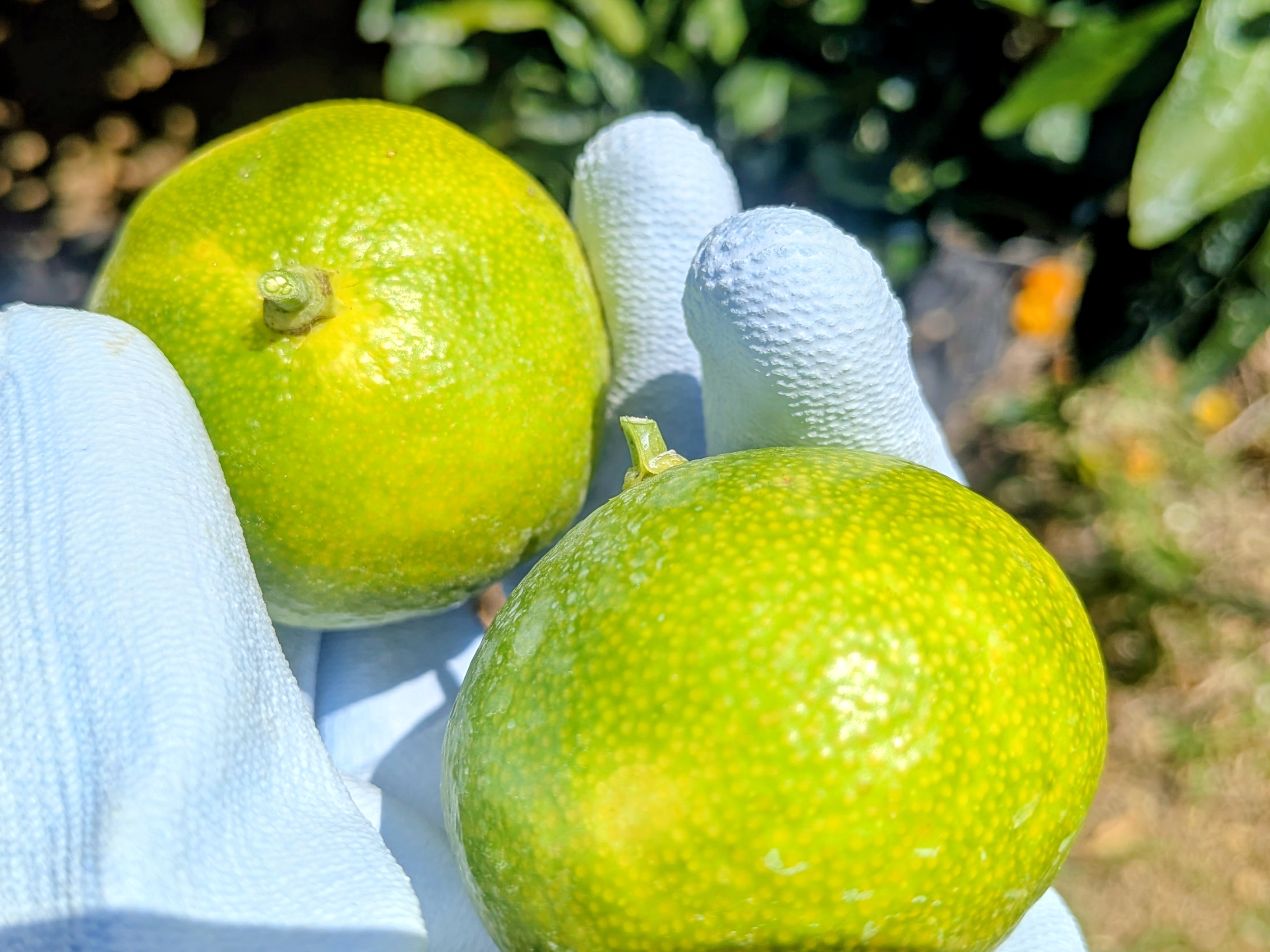 みかん畑に到着すると、辺り一面が濃い緑色の葉を茂らせたみかんの木で埋め尽くされています。太陽の光を浴びた極早生のみかんは、その特徴である明るい緑色を帯びた黄緑色に輝いています。垣内さんは「この場所は大体1ヘクタールですね、畑は全部で18ヘクタールあるので本当に大変です」と話しながら、手際よく作業の準備を進めます。すべての準備が整い、いよいよ収穫のスタートです。基本となる「二度切り」について、「一回でギリギリを切ろうとすると、ハサミで実を傷つけてしまう恐れがあります。逆に枝の部分が残っていると、カゴやコンテナの中で他のみかんを傷つけてしまいます。なので、最初に枝を1~2センチ残して切り、次にヘタのギリギリを切るという『二度切り』が大事になります」と、ゆっくりと実演しながら、その理由を丁寧に説明してくれました。また、みかんの枝による擦り傷や、足元に落ちているみかんによる転倒など、作業の際の注意事項についても指導がありました。