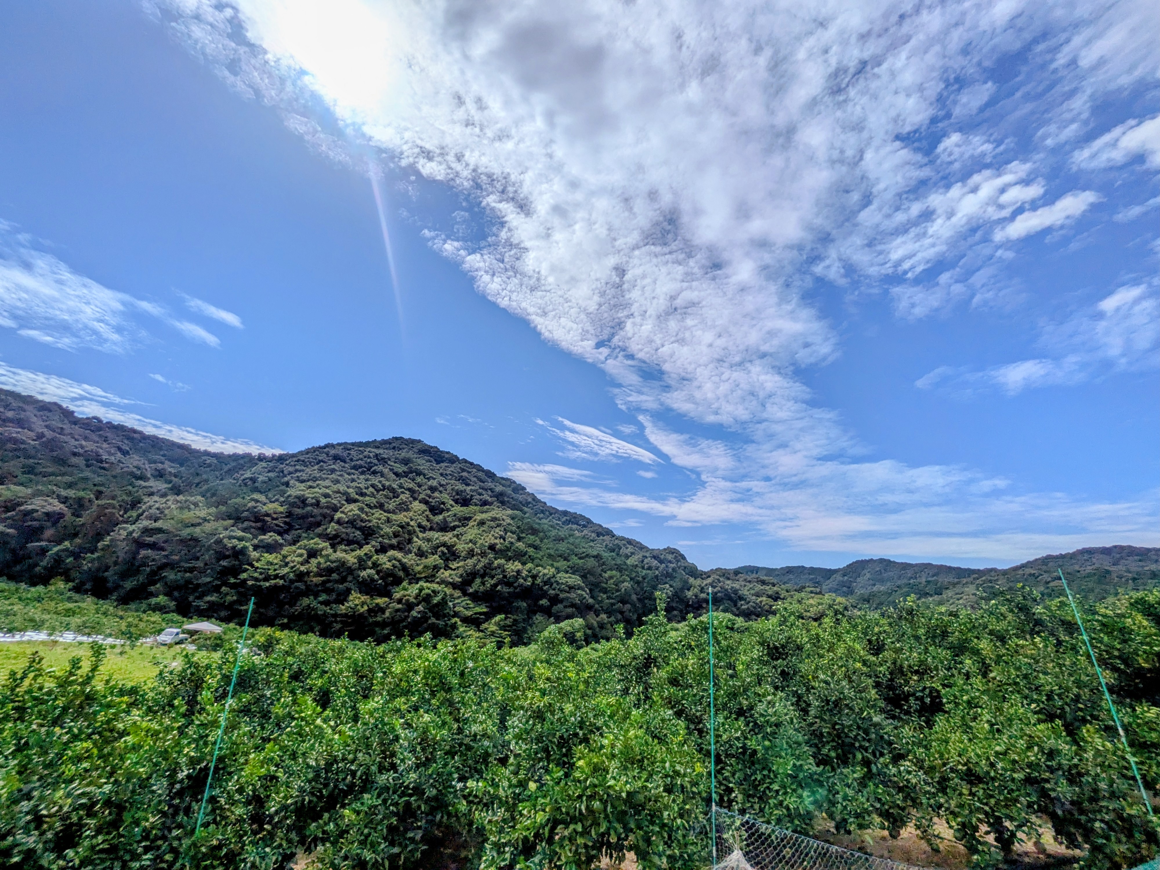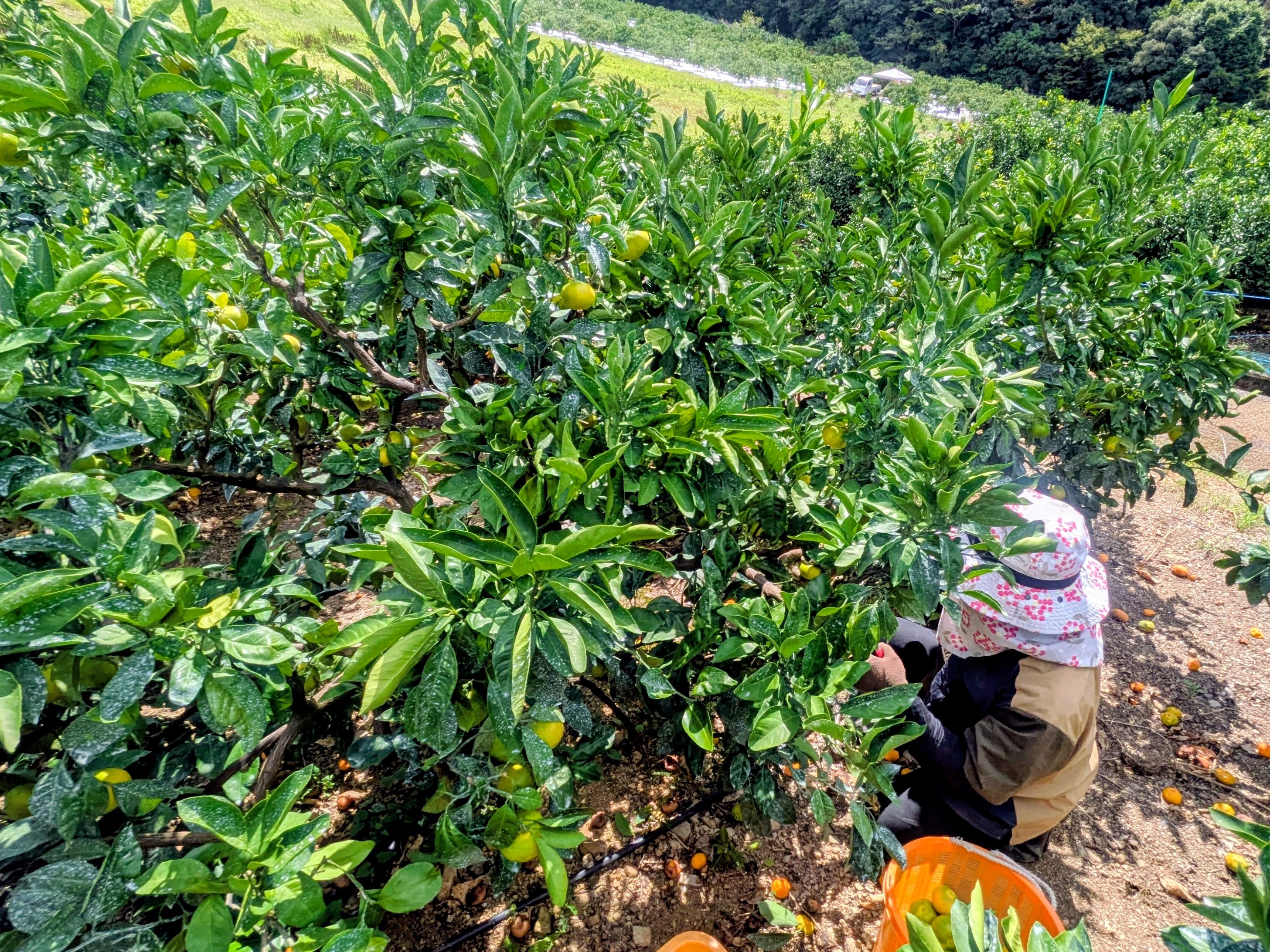 中山さんは教わった通り、一つひとつ丁寧にみかんを収穫していきます。今回はすべての実を収穫する「総取り」のため、葉の裏や枝の奥などの実を見落とさないよう、目線や体勢を変えながら慎重にみかんを見つけていきます。熟練の従業員の方は「分からないことや判断に迷うことがあれば、いつでも声をかけてくださいね」と声をかけ、二人は付かず離れずの距離を保ちながら作業を進めました。作業開始から約1時間後、中山さんに作業の肉体的な負担を尋ねると「身をかがめたり、腕を伸ばしたり、普段あまりしない体勢が多く大変ですが、すごくいい運動になりますね」と笑顔で返答いただき、まだ余裕がある様子です。一連の動作も次第にスムーズになっていき、パチン、パチンという小気味のよいハサミの音が、澄んだ青空に響いています。