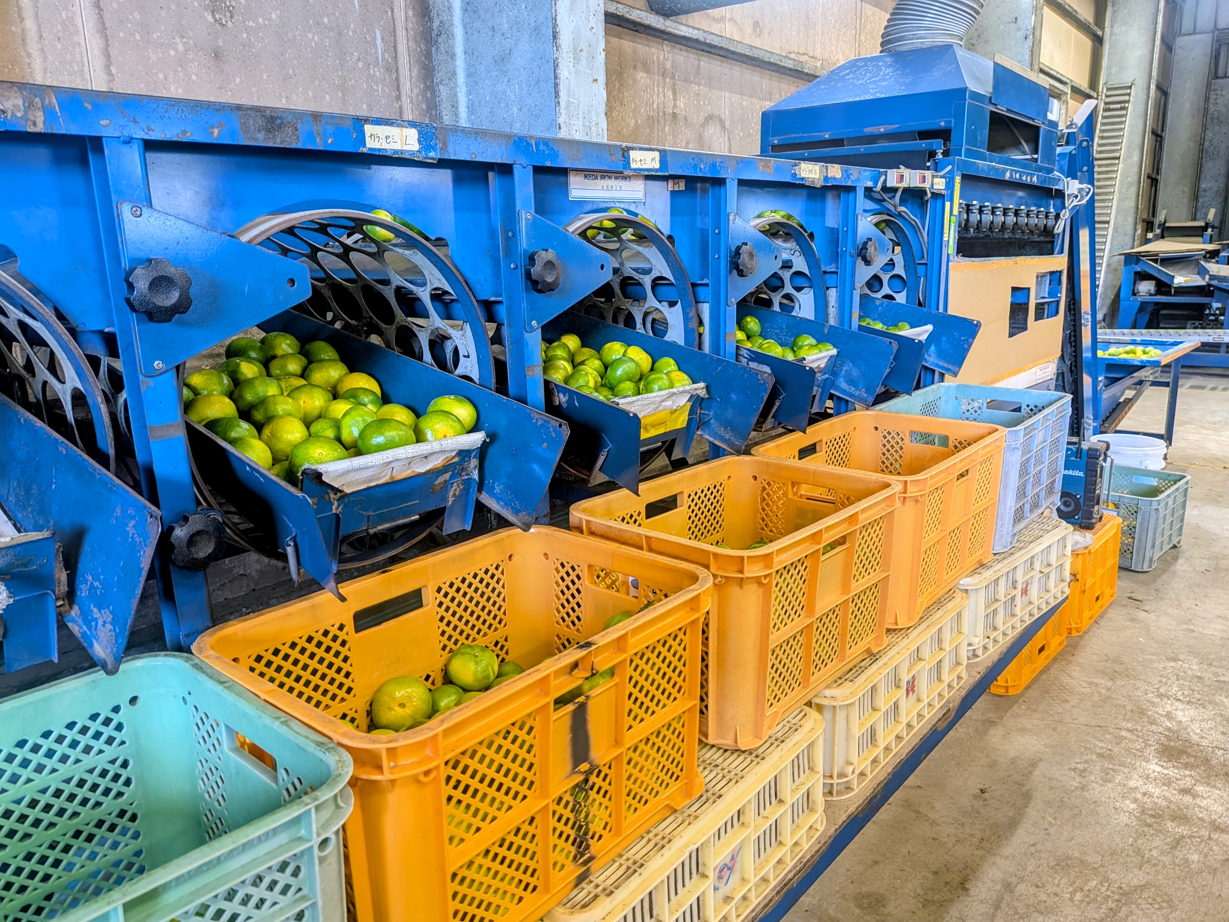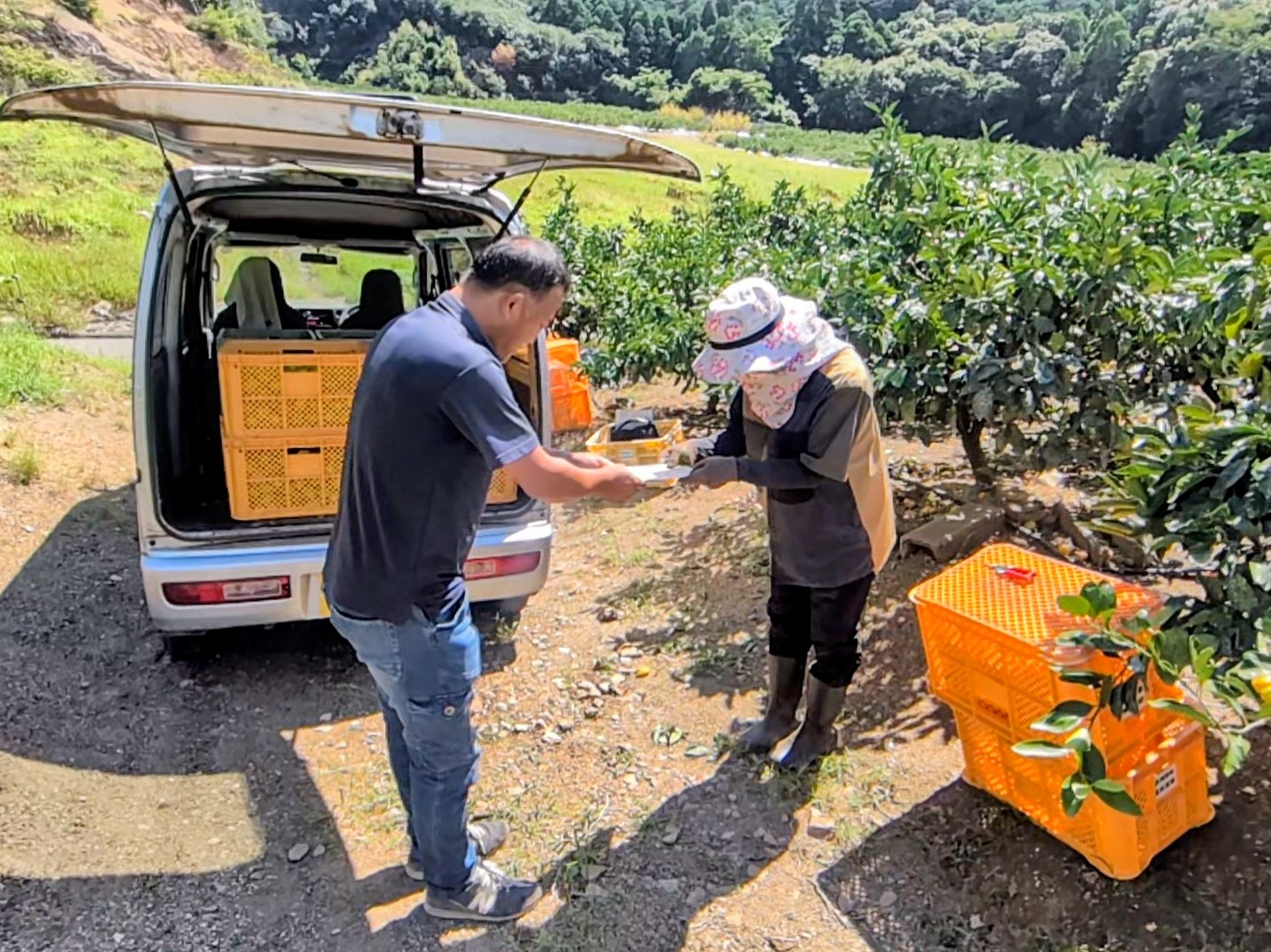午前12時に終了時刻を迎えました。みかんが詰まったコンテナを順番に車に積み込みます。その場で中山さんには給与が支払われ、垣内さんは「大変助かりました。ぜひこれからもお手伝いに来てくれるとありがたいです」と声を掛けました。中山さんも「目の前のみかんのことだけに集中して作業できたので、身体は疲れましたが頭はリフレッシュできました」と感想を伝えました。中山さんは事務所に戻ったあと、みかんがサイズ別に分類され出荷される様子を見ながら、「今日採ったみかんも皆さんに美味しく食べてもらいたいですね。私もこれからは今日のことを思い出しながら、一つひとつ大切にいただきたいと思います」と話し、事務所を後にしました。