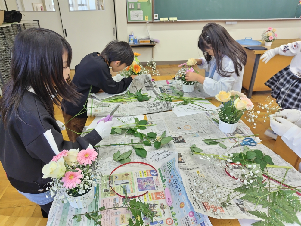 県内での花育を進めるため、花の国づくり三重県協議会と連携し、小学生を対象とした花育体験教室を行いました。令和7年1月は、津市の高野尾小学校で県産の切り花を使ったフラワーアレンジメント体験を、伊賀市の上野西小学校で県産の花壇苗を使った寄せ植え体験をそれぞれ行いました。