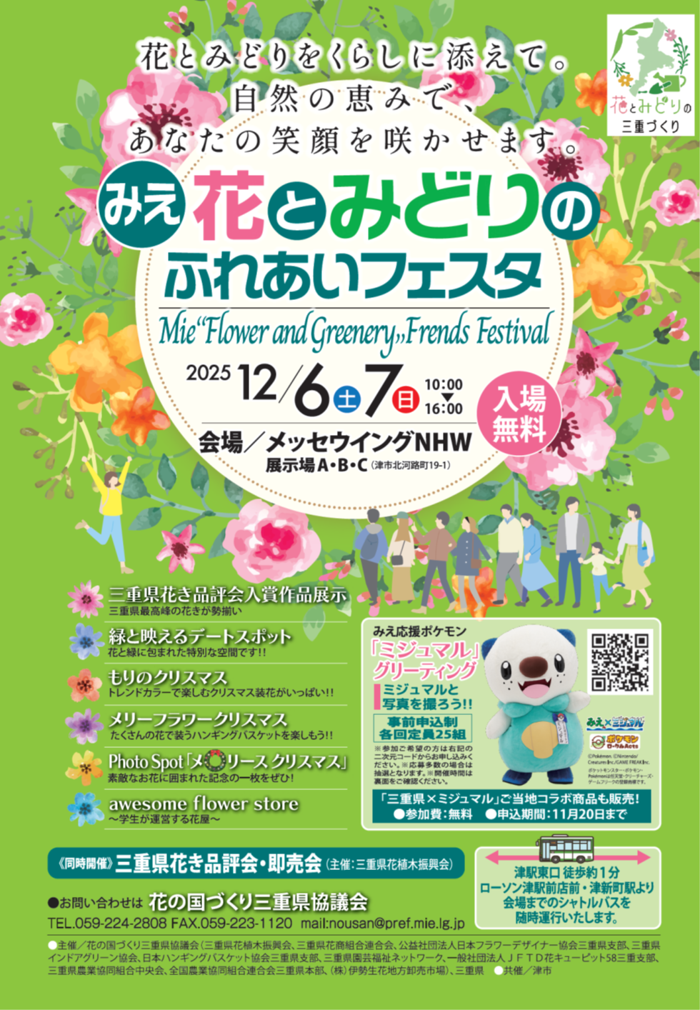 みえ花とみどりのふれあいフェスタのチラシはこちら県産の花とみどりを使った展示やイベント、体験教室、三重県花き品評会入賞作品の展示・即売会等を開催