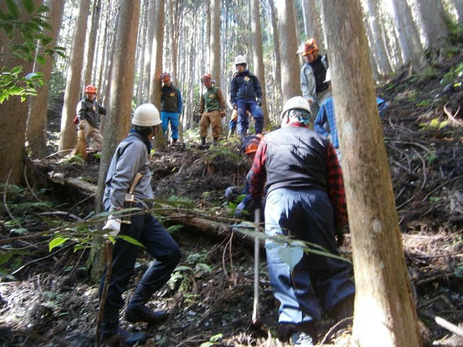 ▲今回からいよいよ林内作業。チェンソーや道具類を確認し、分担して運びます。研修は、作業道を作りながら、材料となる木を現場で調達し、その作業を進めるなかで様々な技術や知識、安全管理などを学んで行きます。まずは山をしっかり見て、作業道をつける場所を見立てます。現場の特徴や立木の状態をどのように把握するのか学びました。