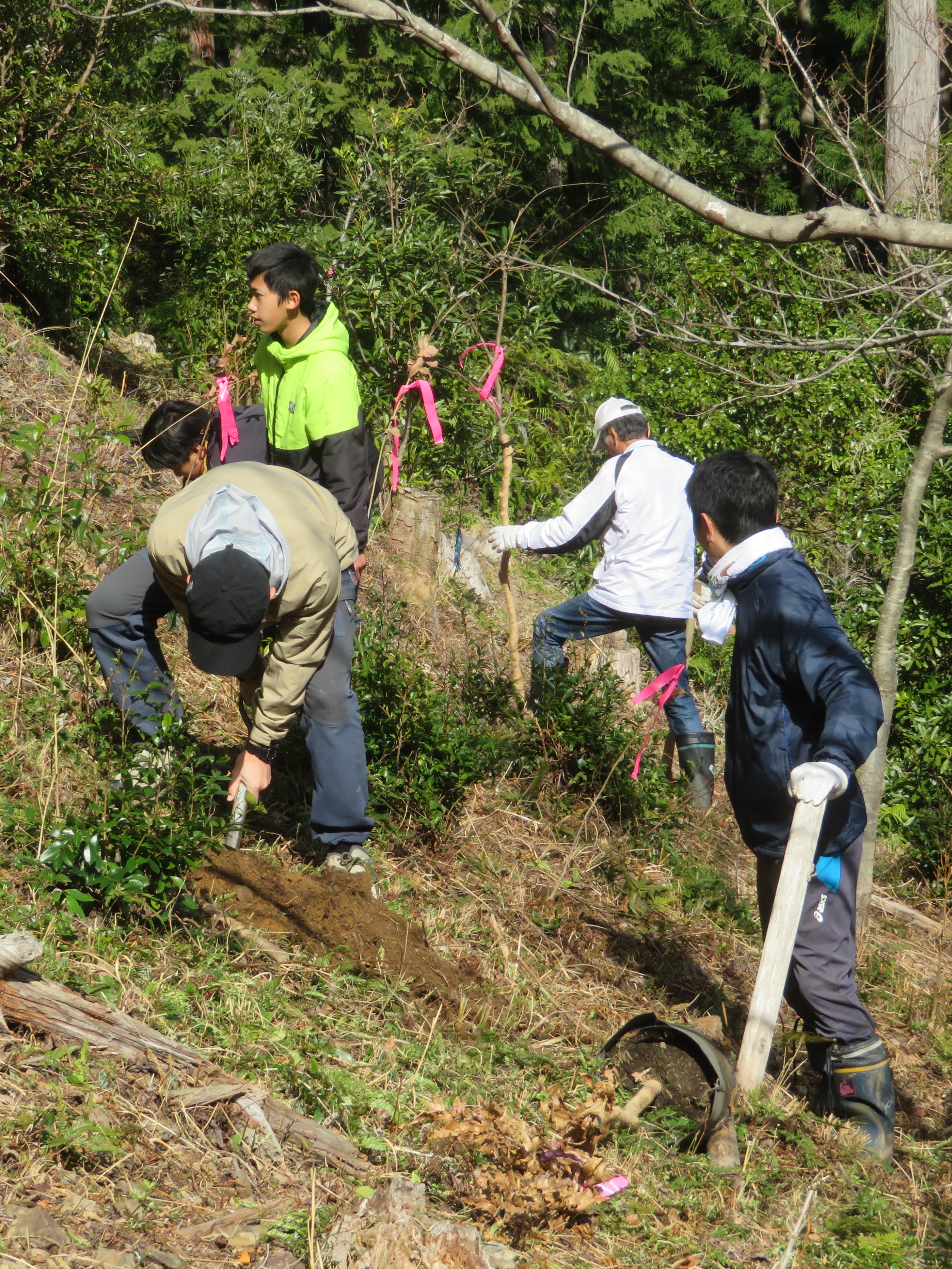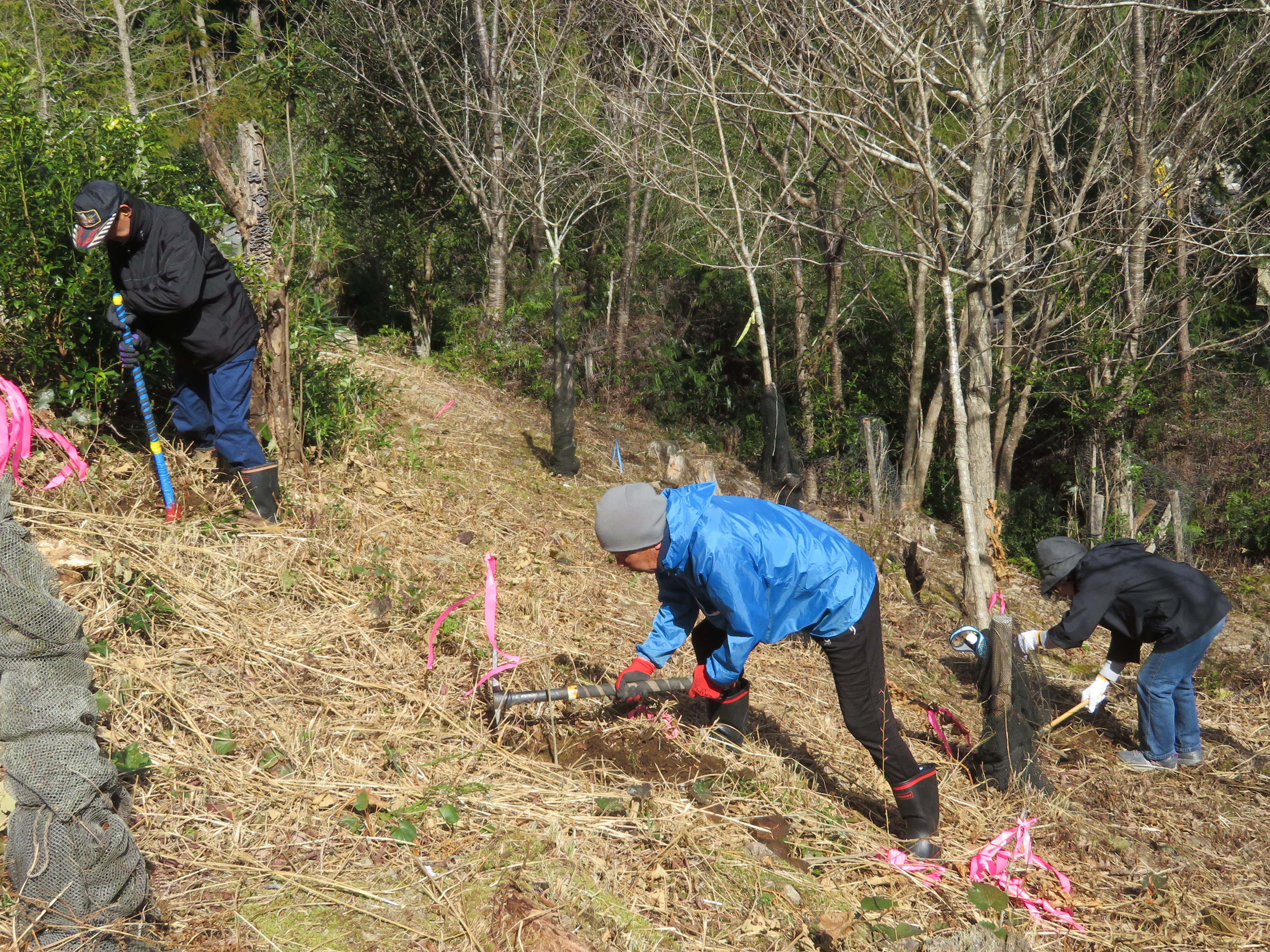この植樹活動は、山に木を植えることにより、豊かな海をつくり、郷土の水産業再生を目指す「山と海をつなぐ会(三重県認定:里地里山保全活動団体)」の主催で、赤羽川漁業協同組合の組合員や紀北町観光協会、みえ熊野古道商工会の関係者など、地元を中心に約40名の方が参加して、ミズナラ、コナラ、クヌギ、モミジなどの広葉樹の苗木「116本」を植栽しました。