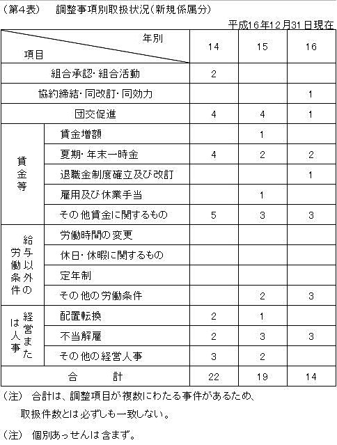 平成16年における労働組合資格審査取扱状況は、前年からの繰越4件、新規申請11件の計15件であり、その内訳は、委員推薦に係るものが5件、不当労働行為に係るものが9件、法人登記に係るものが1件でした。