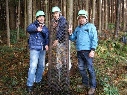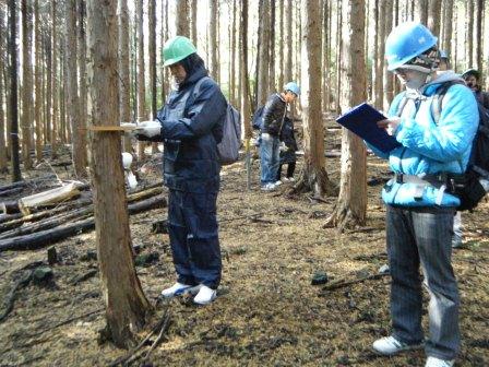 今回の活動は、施業を委託されているNPO法人「森林の風」の指導により、午前中にもみじを30本植栽し、午後からは間伐の実演見学、立木調査等が行われました。当該活動地は紅葉の名所もみじ谷のすぐ近くであり、この活動により、更に多くの方が訪れる森林になっていくと思います。