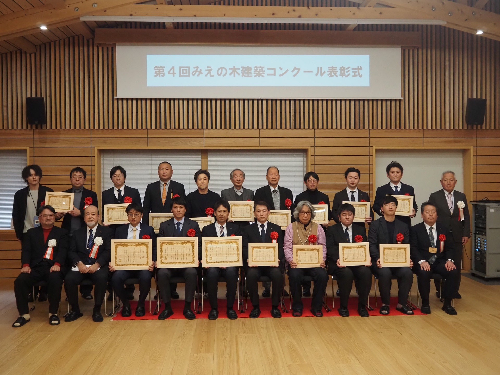みえの木建築コンクール実行委員会が、県産材を活用した魅力的な建築物を募集し、その建築物に関わった方々を表彰するとともに、その事例を広くPRすることで、木づかいの気運の醸成と県産材の需要拡大につなげるため、第4回みえの木建築コンクールを開催し、下記のとおり知事賞、優秀賞、審査員特別賞、計11作品が選ばれ、令和8年1月26日(月曜日)に、みえ森林・林業アカデミー棟において、表彰式を執り行いました。