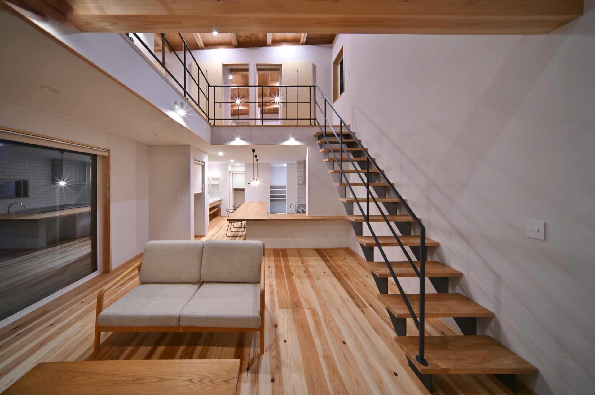 居間に配置されている大断面の柱や、ささら桁階段のように、三重県産大断面材の特徴を活かした丁寧な設計が随所に垣間見え、説得力のある空間表現がなされていた。