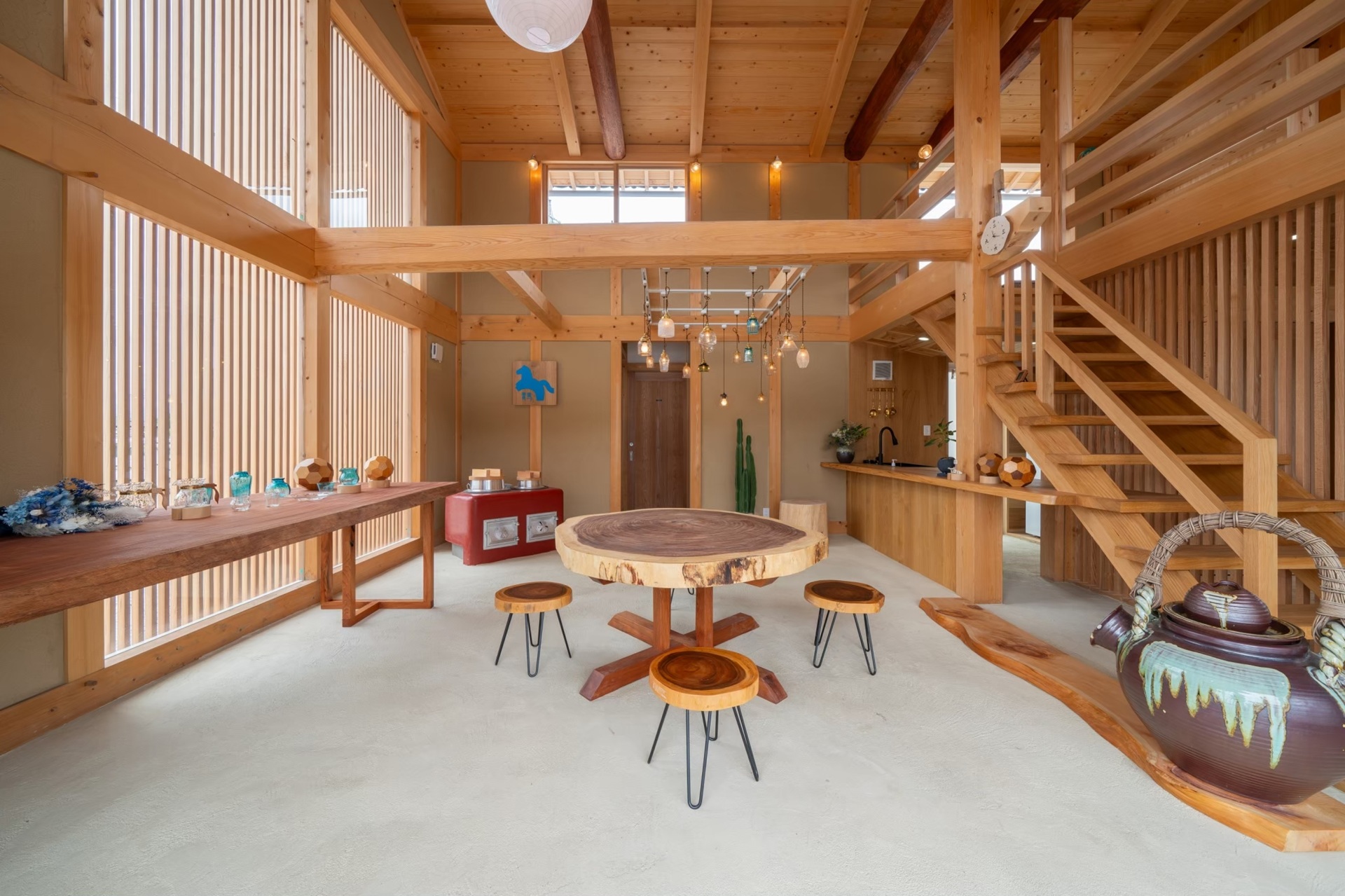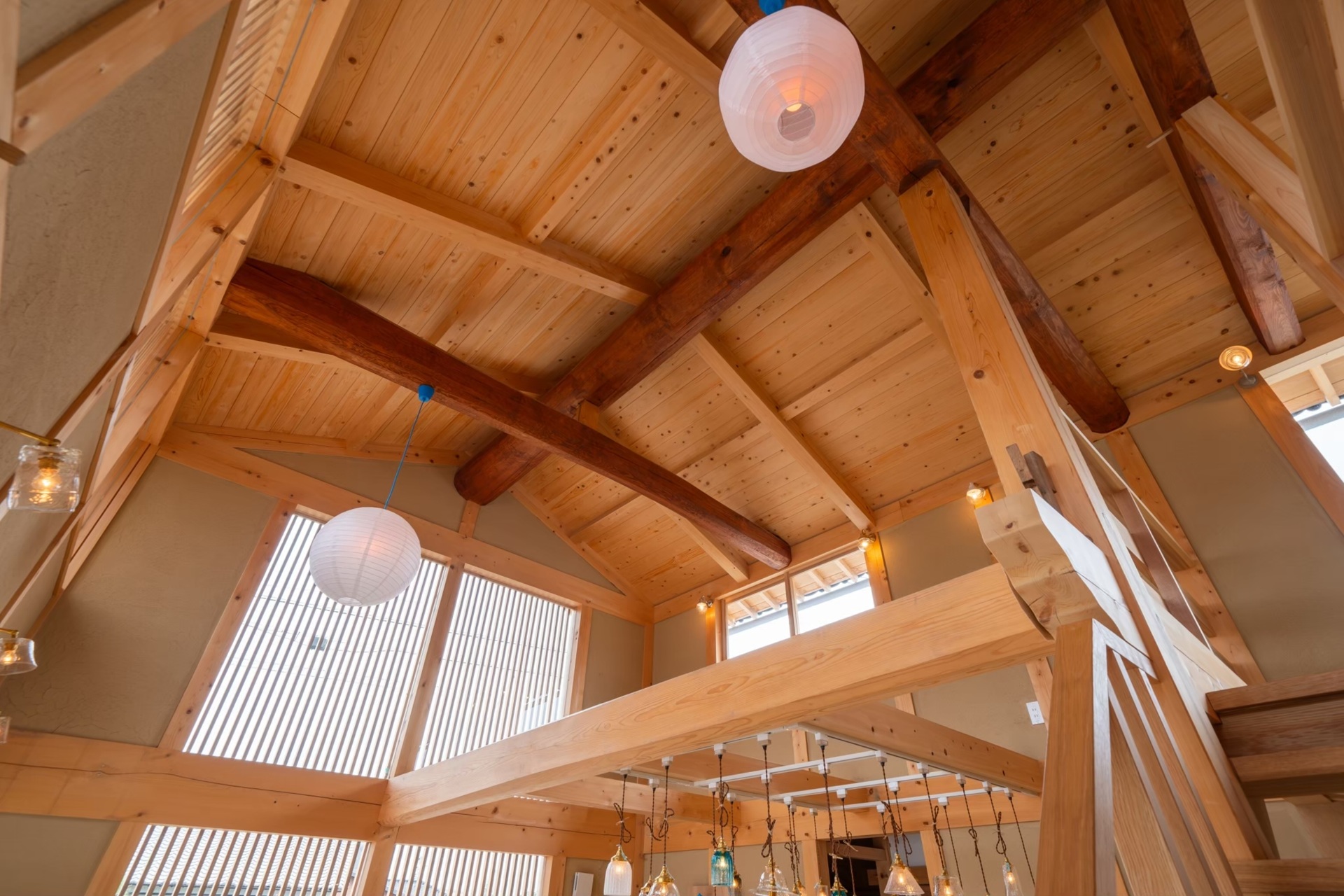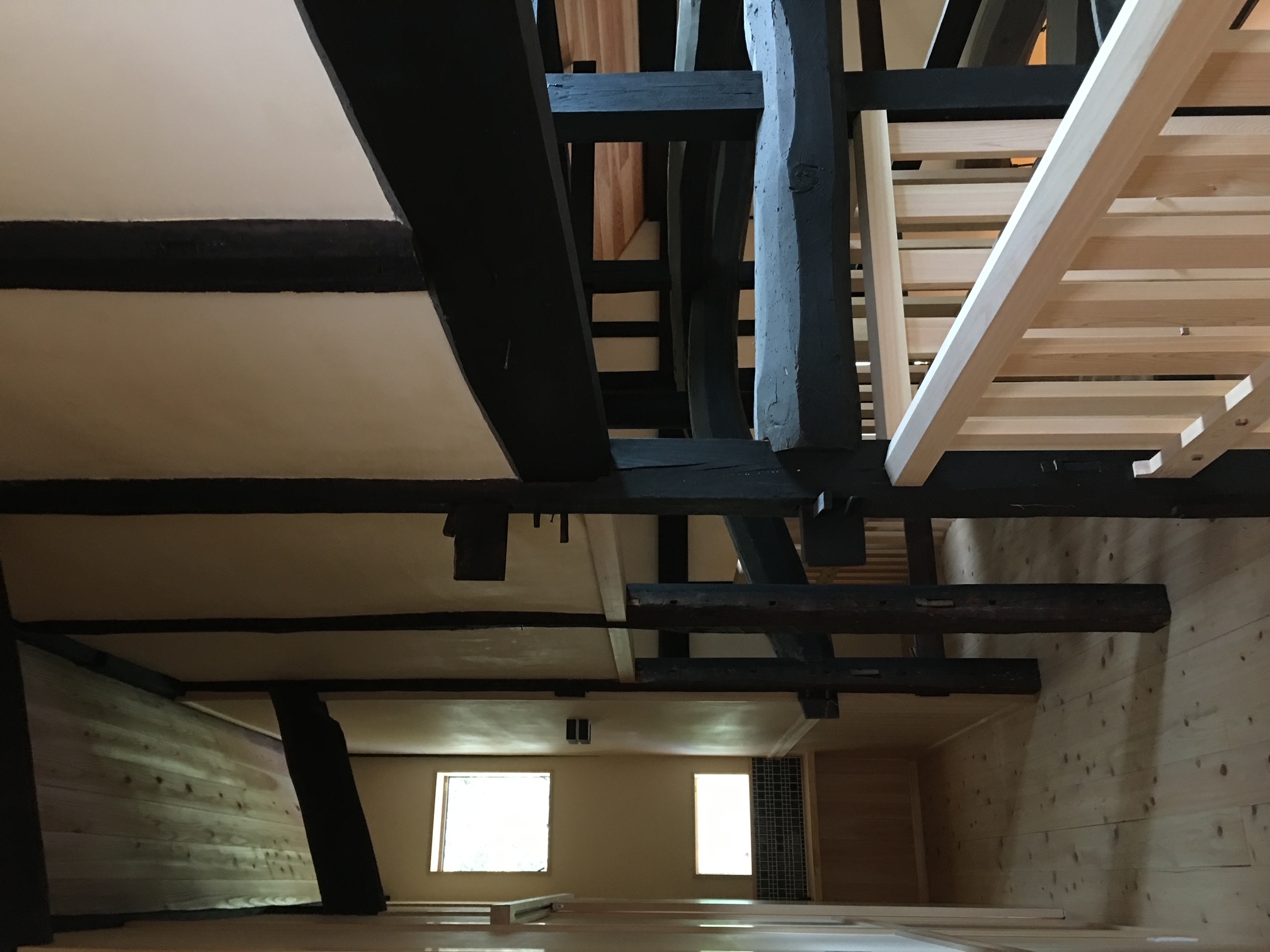 現しとした柱、梁等の力強い木構造の美しさを保ちつつ、現状の傷み等の状況を的確に把握し、柱の根継ぎなどを含め必要な耐震補強を施し、見事に築300年の古民家を再生している。