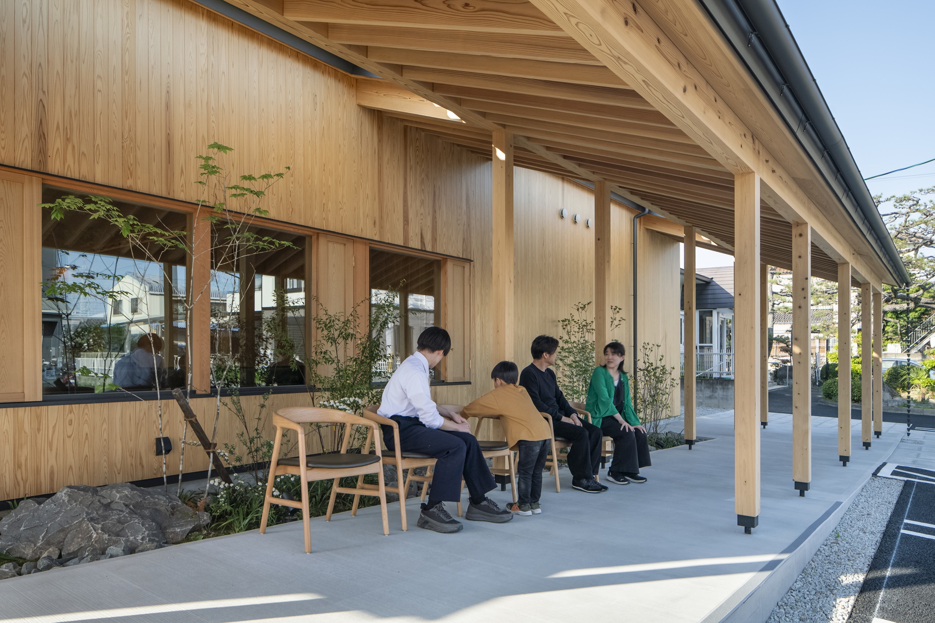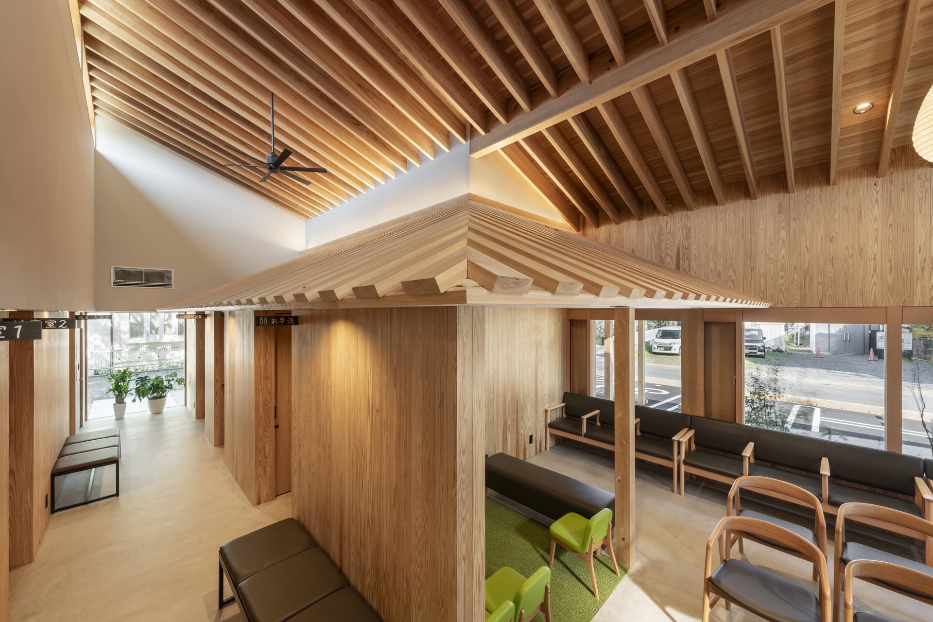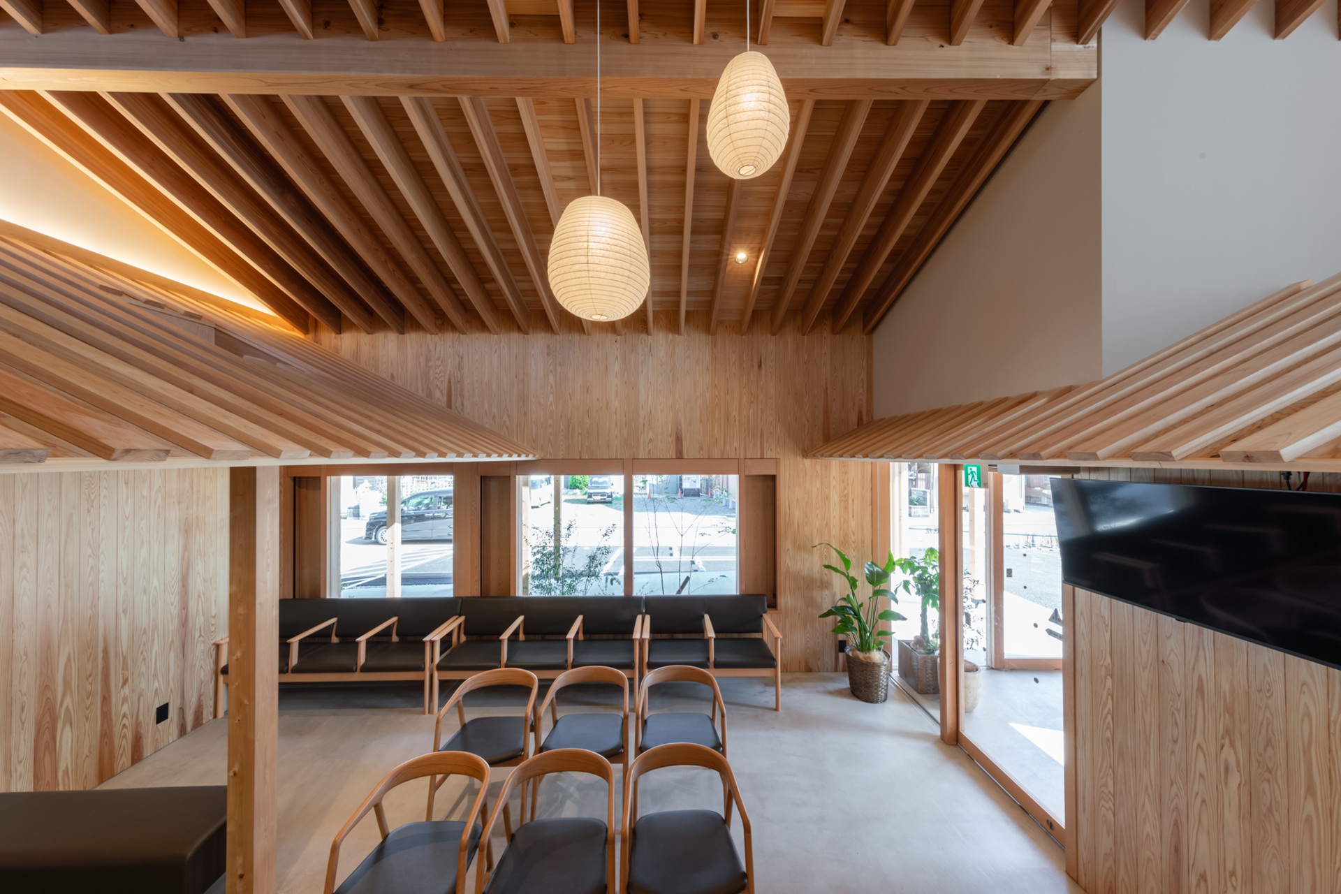 旧街道に面した小規模クリニックである。深い庇が端正なファサードを作り出し、その中に光の差し込む植栽エリアを設けて、地域のコミュニティに開かれた明るいアプローチ空間を実現している。土間はそのまま内部まで連続し、入れ子状に掛けられた木の屋根が街道の続きのような雰囲気と同時に、子どもから高齢者まで様々な患者さんに寄り添う優しさを感じるスケール感を待合空間に作り出している。以上のような地域のクリニックとしてのデザインと併せて、木材利用の工夫として、製材所と連携した木取りで構造材と仕上材の双方に熊野産のスギとヒノキを活かした点も高く評価された。