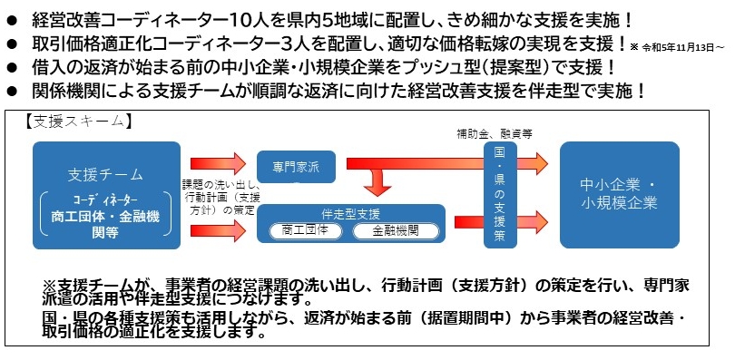 「新型コロナウイルス感染症対応資金」等を利用している中小企業・小規模企業が順調に借入を返済し、事業を発展的に継続できるよう支援を行う「経営改善コーディネーター」と、物価高の長期化の影響によるコストの上昇分を適切に価格転嫁できるよう支援を行う「取引価格適正化コーディネーター」を、三重県中小企業支援ネットワークの事務局である三重県信用保証協会に配置します。