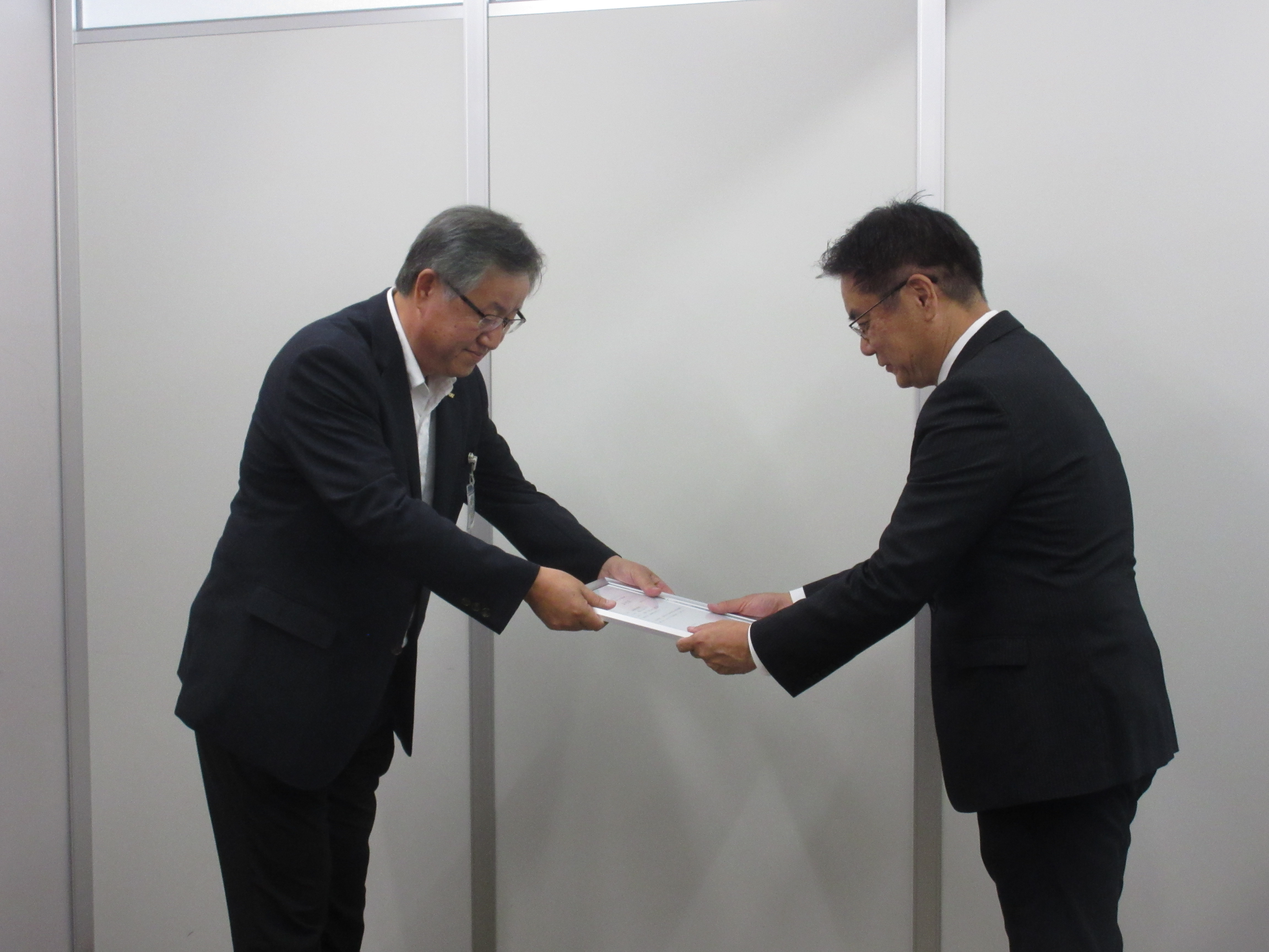福井 敏人 医療保健部長(左)から、常盤薬品工業株式会社 取締役 森岡 恒男 様(右)へ認定証を手渡しました。