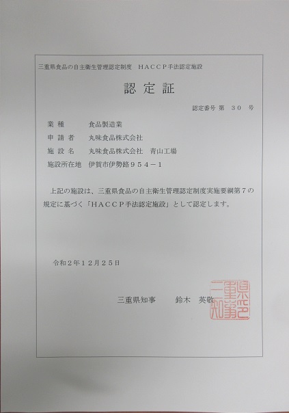 丸味食品株式会社 青山工場が、三重県食品の自主衛生管理認定制度の第30号に認定されました。