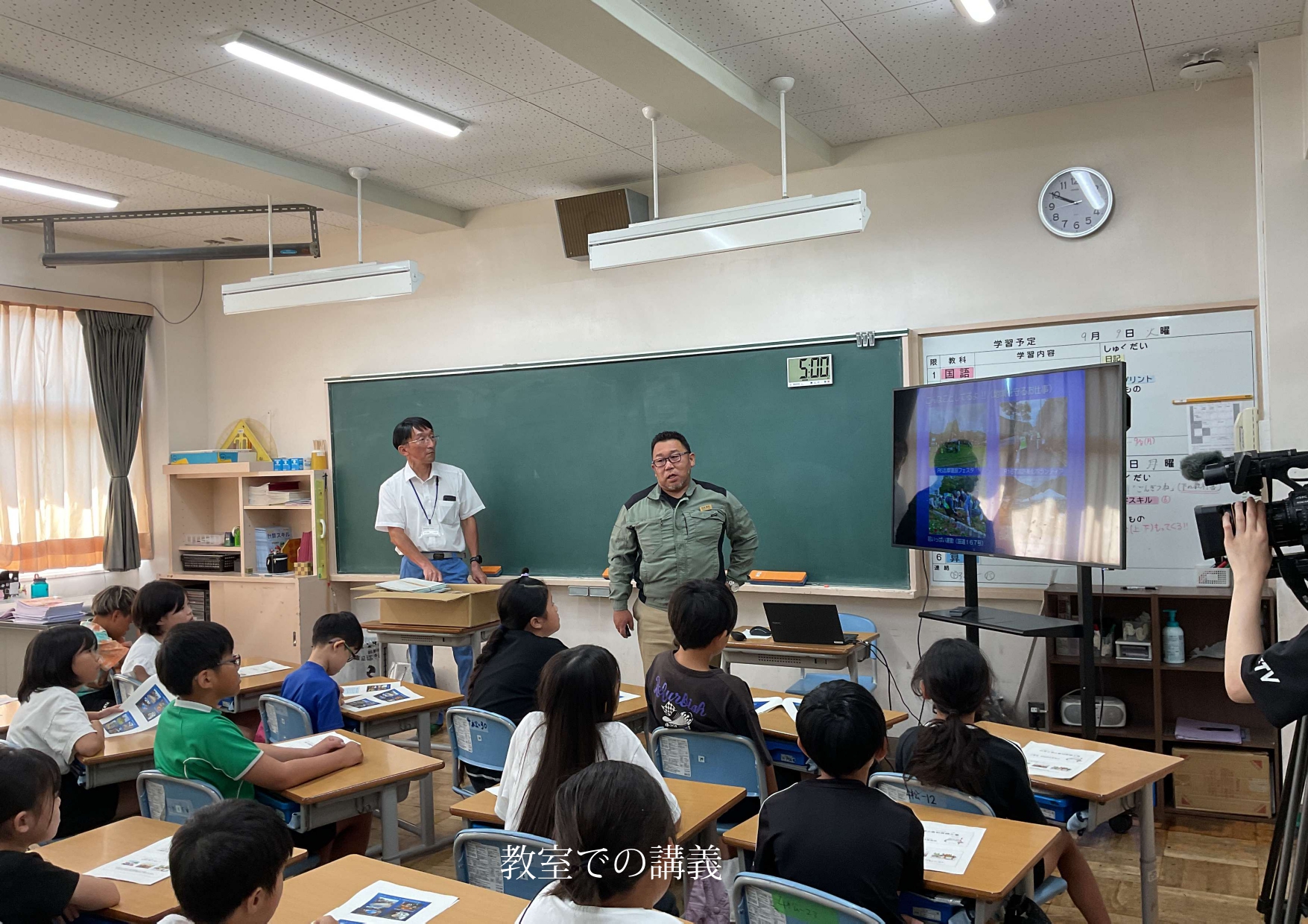 児童たちは小学校の教室で、公共工事の役割や仕組み、橋ができるまでの工事の様子、建設業の仕事内容や工事の事例などの説明を受けました。普段見慣れない大人たちに囲まれ、ケーブルテレビ局の取材もある中、緊張しながらも熱心に勉強していました。
