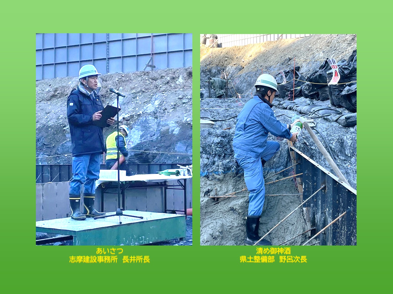 式典は、当事務所の志摩建設事務所長による挨拶で始まり、参列者全員で工事の安全を祈願しました。お神酒、塩、米によるお清めの儀の後、参列者が見守るなか、日本最大級となる25t吊りタワークレーンと6㎥コンクリートバケットを使い、初打設となるコンクリートが打設されました。 式の最後には、出席者全員による万歳三唱が行われ、記念すべき工事の節目を祝いました。