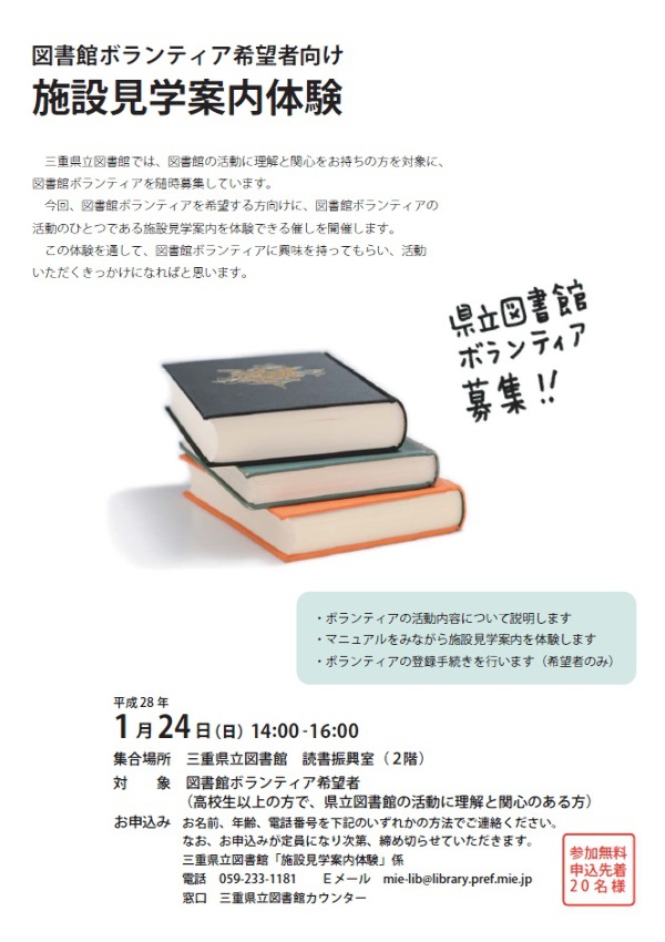 三重県立図書館では、図書館の活動に理解と関心をお持ちの方を対象に、図書館ボランティアを随時募集しています。