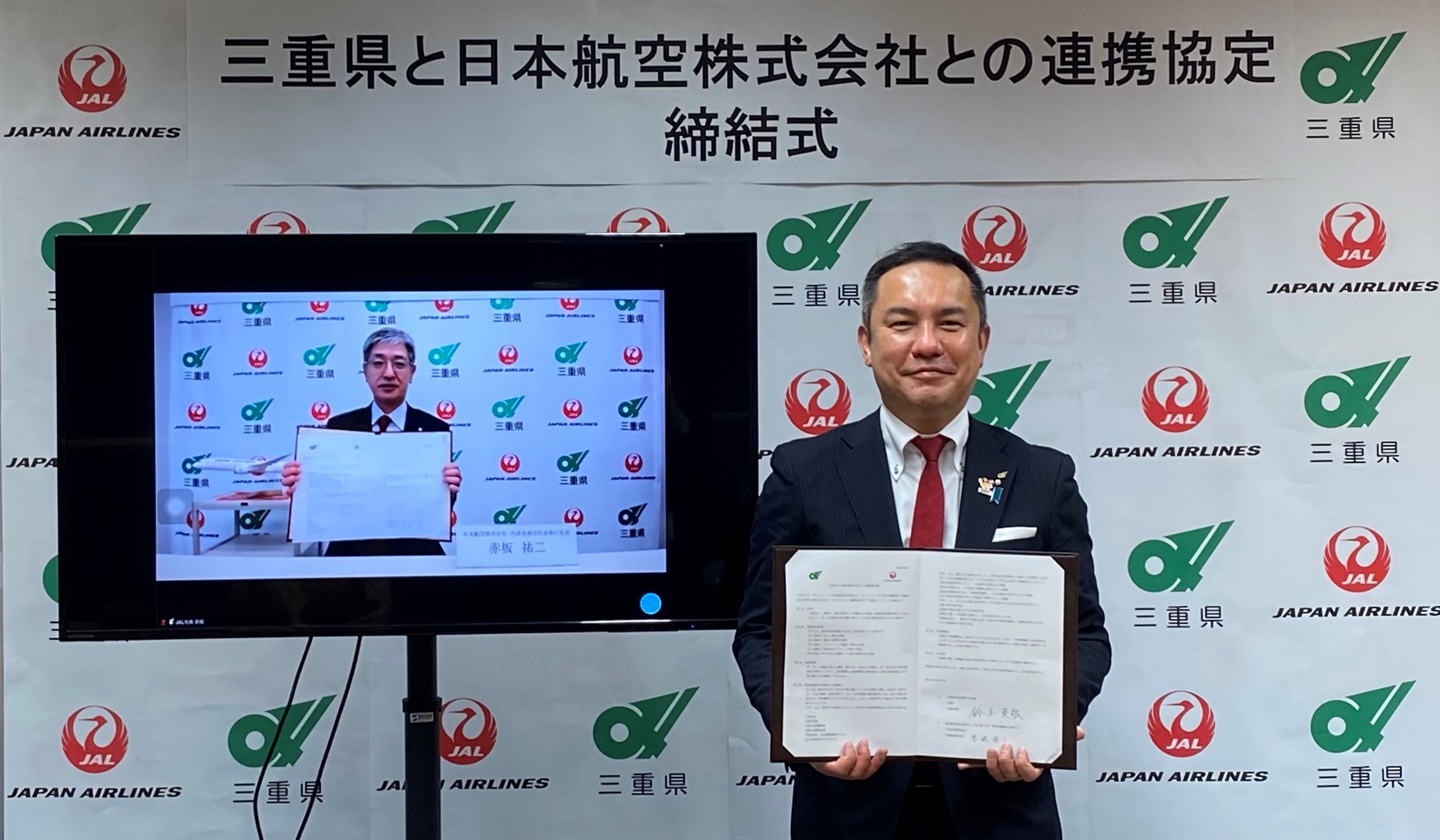 三重県と日本航空株式会社は、平成27年(2015年)に締結した「三重県と日本航空株式会社との「食」と「観光」に関する協定」に、「次世代モビリティ」と「ワーケーション推進」に関する項目を追加した連携協定を新たに結ぶための締結式を下記のとおり開催しました。