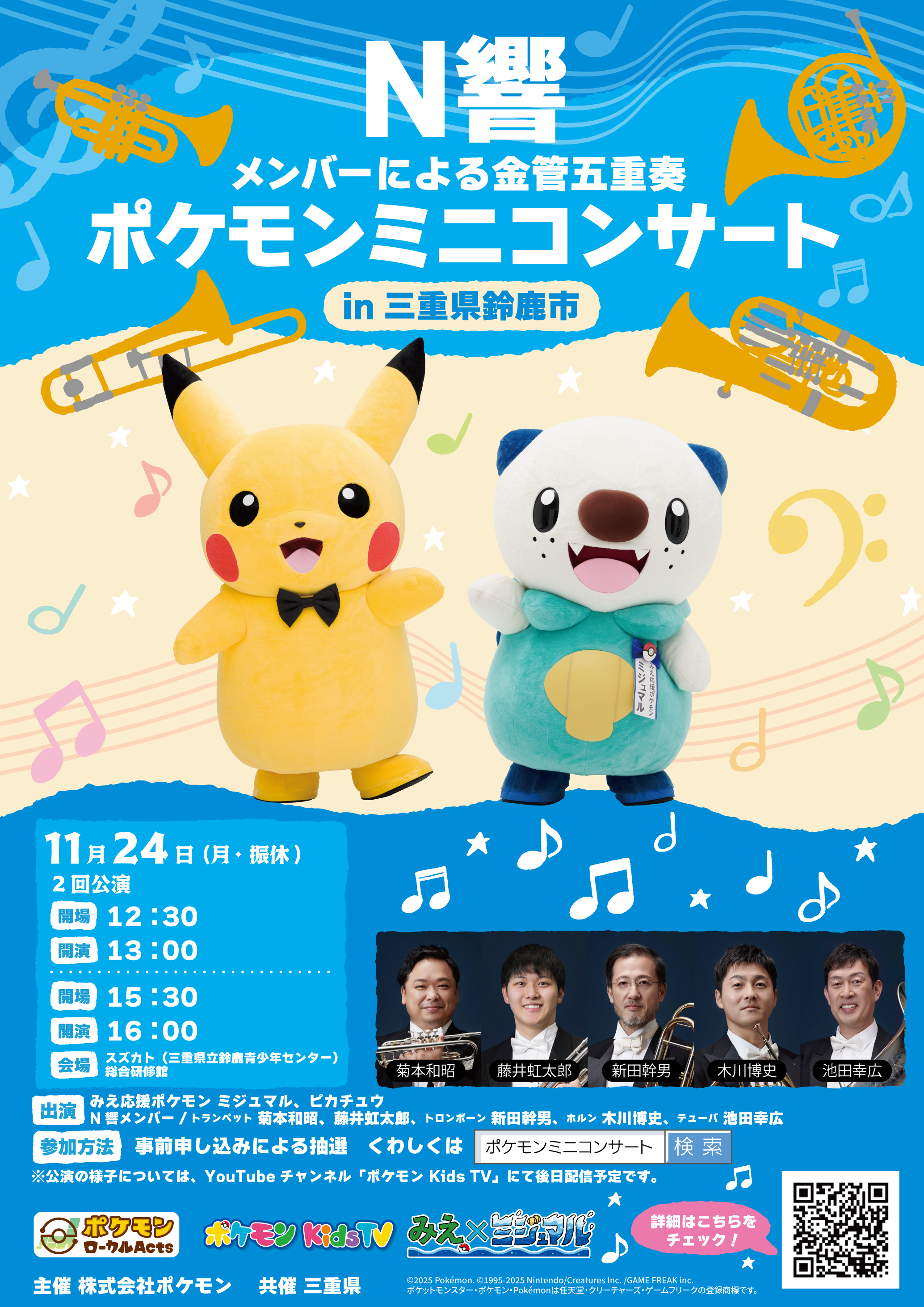 株式会社ポケモンは、NHK交響楽団と協力し全国各地の子どもたちにポケモンと音楽を通じて笑顔を届けることを目標とした「N響メンバーによるポケモンミニコンサート」を定期的に開催しています。令和4年12月に開催された「復興支援 N響メンバーによるポケモンミニコンサート in 福島県浪江町」をはじめ、現在は「ポケモンローカルActs」の自治体を中心にコンサートが開催されています。三重県では今回が初めての開催です。