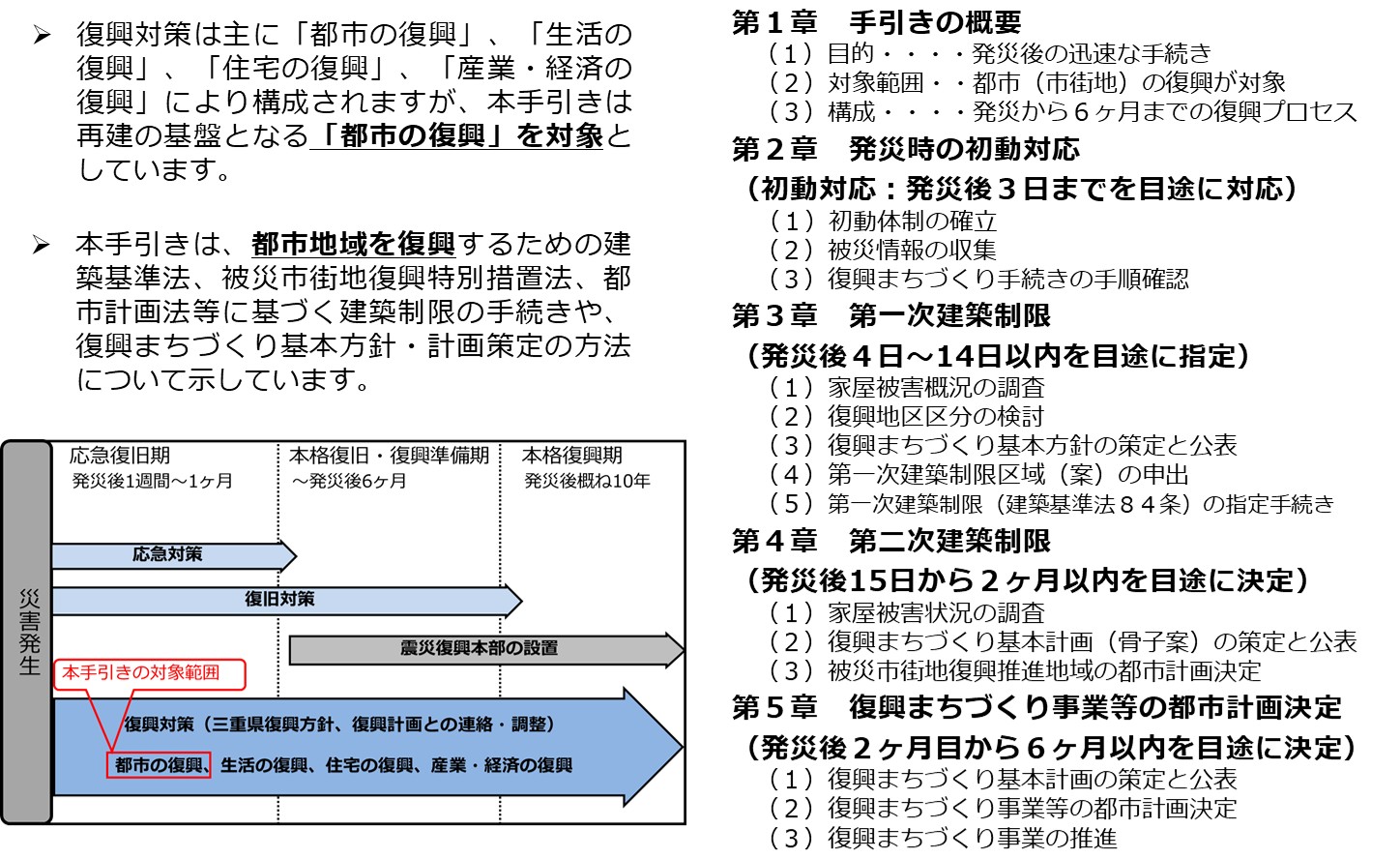 発災後に速やかに復興まちづくりに着手できるよう、被災調査から建築制限、都市計画決定等に至る各種法手続きを整理し、あわせて必要な様式を示した事務的なマニュアルとして、本手引きを取りまとめました。