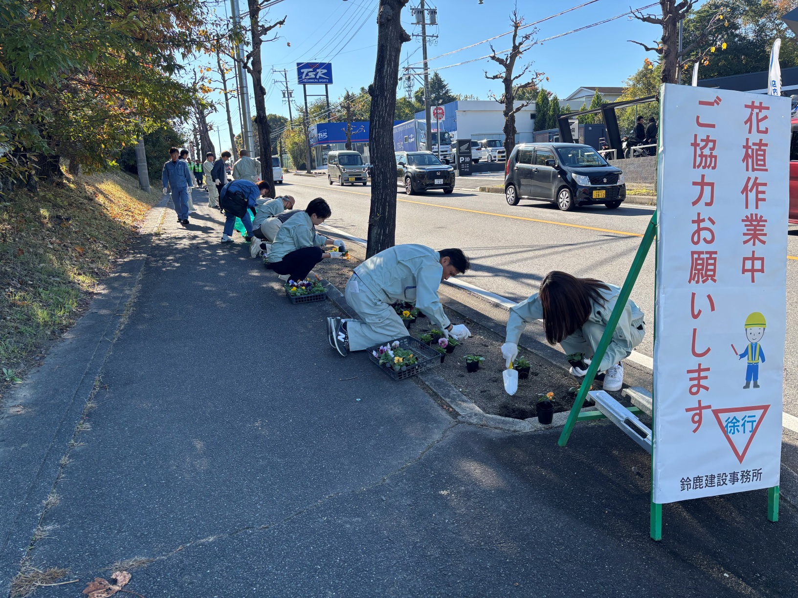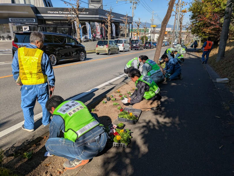 令和7年11月15日(土)、鈴鹿市住吉町地内の県道三行庄野線沿い(延長約820m)において、環境美化活動を実施しました。この活動は、本年7月に開園したミジュマル公園周辺の環境美化を目的とした花植え活動です。