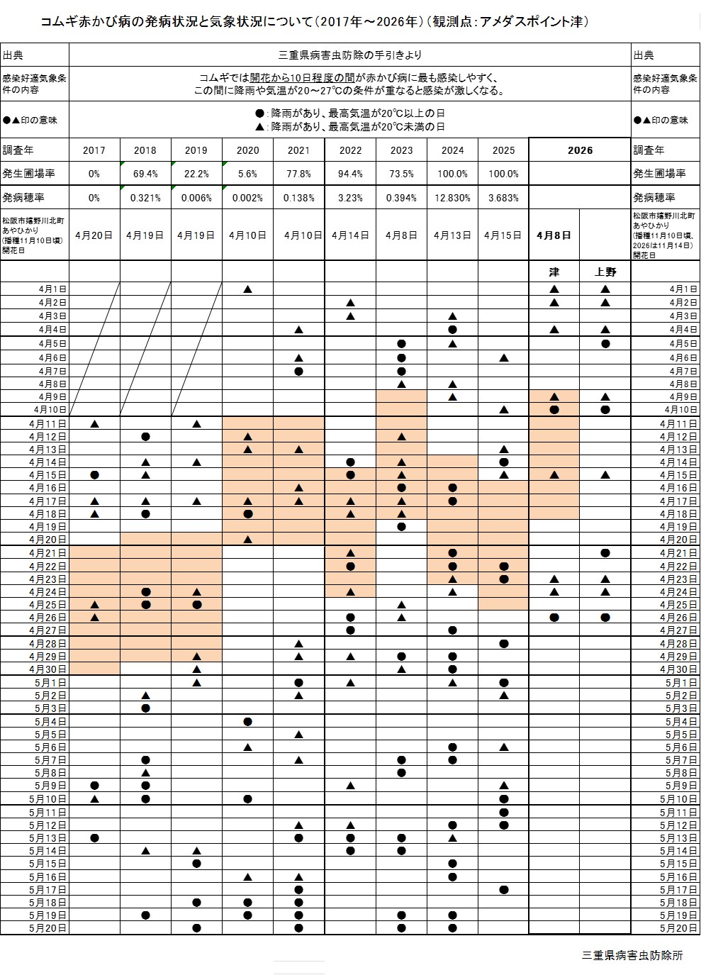 - 特に、開花期以後に降雨が続き、気温が高く推移した場合は、多発する可能性があるので、追加防除を行いましょう。