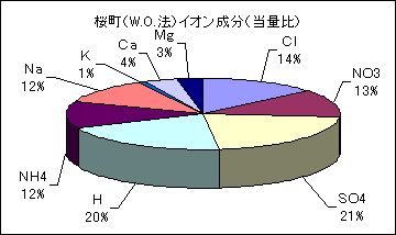 | 右の図は2002年度の四日市市桜町の降水に溶け込んでいる イオン成分を調べたものです。(W.O.法) プラスイオン6種類とマイナスイオン3種類でイオンバランスはとれています。 |
