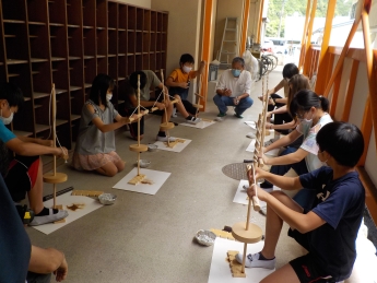 次は、「舞いぎり法」による火おこしに挑みました。当日は晴れで湿度が低く、火おこしには絶好の日和であったので、何とか6人全員に達成感を味わってもらうことができました。