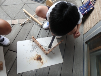 火おこし体験は、雨天で湿度が高かったため、煙は出るものの、なかなか発火はしませんでした。子どもたちは諦めることなく、友達と協力して火種をつくったり、煙たいのを我慢して息を吹きかけたりする姿が見られました。頑張った成果で、何とか約20人が火を起こすことができました。アンケートには「火はつかなかったけど、初めて体験することができてうれしかった」などの感想があり、楽しい経験になりました。火おこしの合間に、黒曜石で葉っぱや野菜を切ったり、石包丁で稲穂を摘み取ったりする体験も行いました。