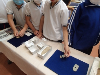 昔のくらしを学び、遺物にふれる体験では、校区の遺跡地図やいなべ市から出土した縄文土器などの遺物を活用しました。子どもたちは、芽指(めさし)遺跡の上に員弁西小学校があること、東海環状自動車道建設のため発掘している空畑(そらばた)遺跡から出土した縄文土器にふれる体験などを通して、歴史や遺跡を身近に感じていました。