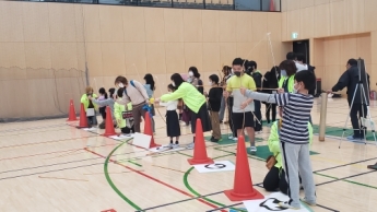 会場到着後、団体役員とジュニアリーダーに体験の内容を説明して、役割を分担しました。子ども会の役員には、子どもたちに弓矢の使い方の説明を、ジュニアリーダーには子どもたちと一緒に弓の準備をお願いしました。今回は、弓の張力を体験してもらうために、弓に弦を張るところから体験をスタートしました。