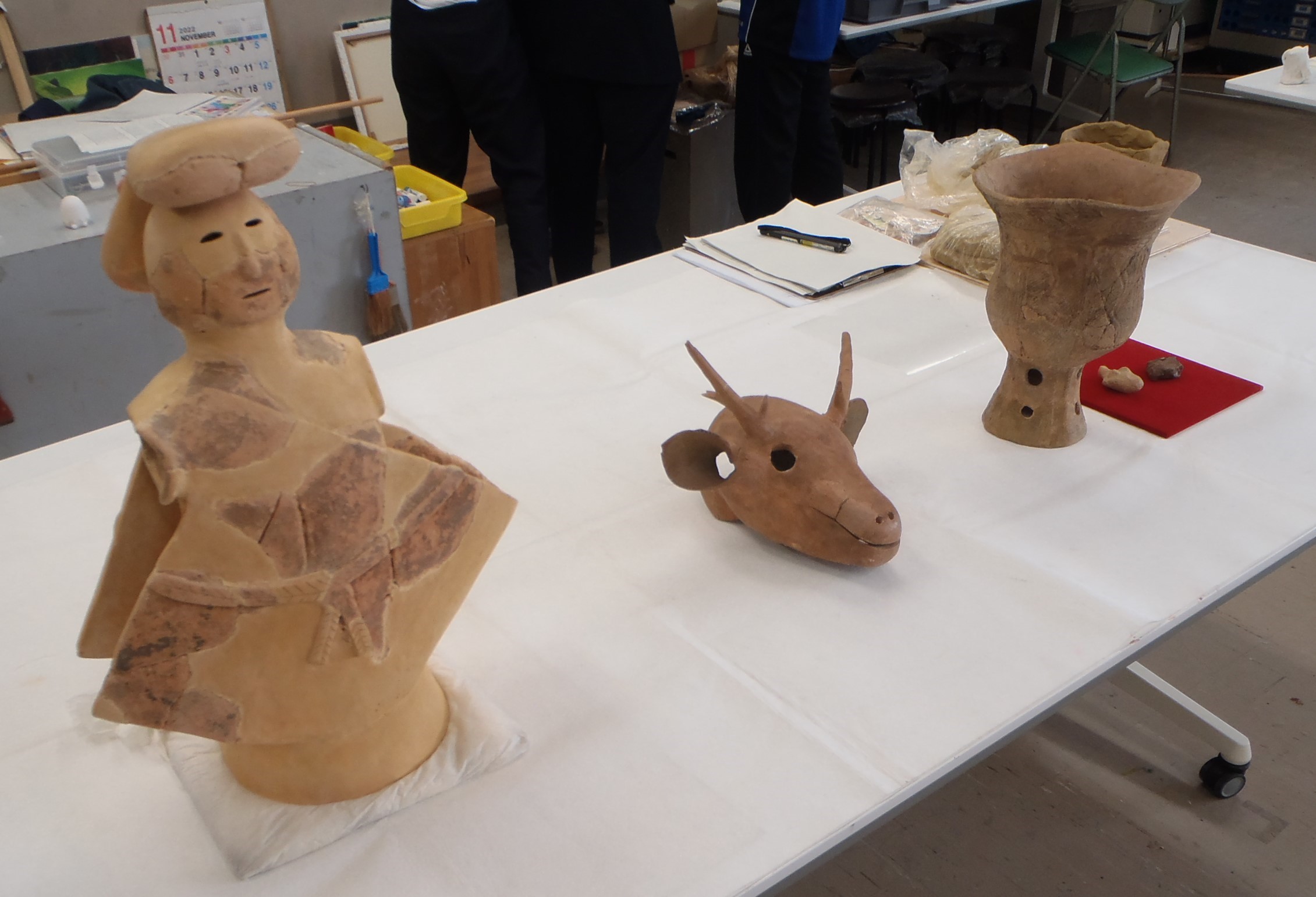 美術の授業で埴輪をモチーフとしたランプシェード作りをしました。まずデザインの参考となるように実物の埴輪や縄文土器などを観察しました。埴輪は高校の敷地周辺に広がる石薬師東古墳群で見つかったもので、縄文土器は鈴鹿市の東庄内B遺跡で見つかったものです。埴輪や縄文土器の種類や用途について説明しました。生徒から「自分の住んでいる三重で、こんなに歴史的な埴輪、土器が見つかっていたのだと思った。」「遺跡から発掘したものの実物に触れることで、昔の技術を肌で感じられた。」と感想がありました。