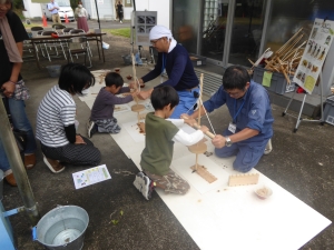 木と木をこすり合わせ、まさつ熱で火をおこす「まいぎり式」で火をおこしました。まさつにより、火種ができたら、ほぐした麻につつんでうちわであおぎます。うまくいかなくてもやり直して、パッと火がつくと、みなさんから歓声がおこりました。
