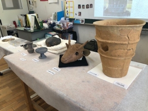 最初にスライド等を使用しながら古墳についての説明と、美旗古墳群の紹介を行いました。生徒のみなさんは、こちらからの質問に対して積極的に発言するなど熱心に取り組んでくれていました。講義の中でも持参した遺物を紹介していましたが、講義終了後、前に展示した遺物に触れたり、間近に観察したりする時間をとりました。事後の感想に「むかしのたからものを、さわれて、うれしかったです。」と書いてくれた生徒もいるなど、みなさん楽しそうに遺物に触れていました。