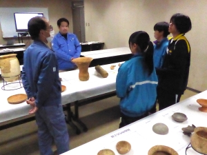 1日目は最初に埋蔵文化財センターの仕事と考古学の方法論についての講義を行った後、県内の遺跡から出土した旧石器時代から弥生時代までの遺物を観察し、道具の形や組み合わせなどから使われていた時代を考えました。その後、館内見学を挟んで、土師器焼成坑が多数出土している明和町内の北野遺跡についての講義を行い、年代別に展示した土師器を観察して形の変化などについて気づいたことを出し合う意見交換を行いました。生徒は本物の土器や石器に初めて触れたことで、生き生きと活発に発言してくれていました。