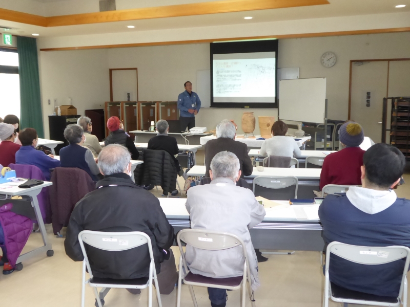 今回は古代の飯野郡の歴史をテーマとし、参加された櫛田町、豊原町在住の方々に遺跡の歴史や考古学に関するお話を聞いていただきました。特に天王山遺跡、瀬干遺跡の弥生時代の集落やお墓のこと、また天王山1号墳の概要について詳しく取り上げました。