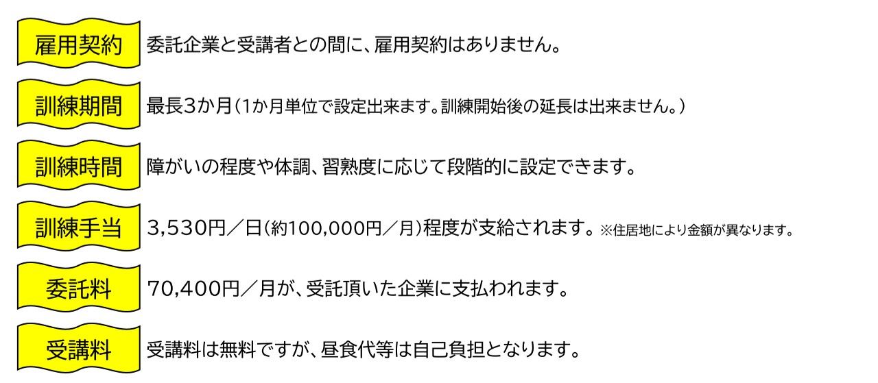 この事業は、企業をはじめ社会福祉法人等、地域の多様な職業現場で職業訓練を行い、就労に必要な知識や技能を習得することを目的としています。
