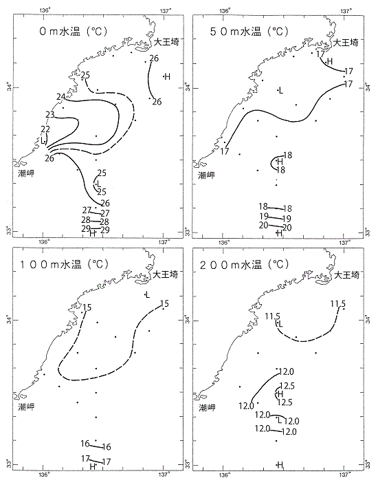 調査時の水温は、表面は21.8~29.2℃、50mでは16.2~20.5℃、100mでは14.3~17.1℃、200mでは11.5~12.5℃の範囲にあった。水温は、南部沖合域(測点29,30)を除き、表面及び50mでは平年より1~5℃前後低め、100m及び200mで概ね平年並であった。8月上旬頃に発生した沿岸湧昇の影響により低水温が顕著で、測点11,12,29の表面、測点29の50mで同月の過去最低水温を更新した。一方、南部沖合域の水温は、表面では平年並~低め、50m、100m及び200mでかなり低めであった。