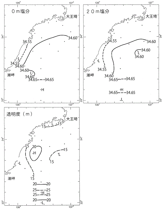 塩分は、表面は34.52~34.67、20mでは34.52~34.66、200mでは34.31~34.66の範囲にあり、表面、20m及び200mで概ね平年並であった。