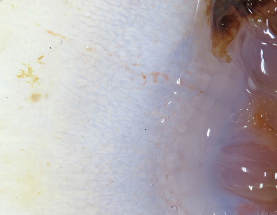 傘を拡大してみると、青紫色の細い筋のようなものが多数見えます。傘の鮮やかな色彩は、この筋によって作り出されているようです。