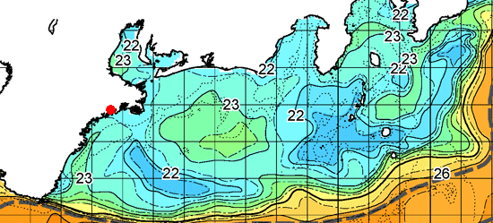 上の図はイボクラゲの出現する前の調査日、下の図はイボクラゲが混獲された日の海況です。これといって、大きな海況上の変動はなく、表面水温は季節と共に順調に低下しているようにみえます。タイトルにあるように、イボクラゲは暖海性として知られていますので、例えば黒潮からの顕著な暖水波及と出現が同期していれば「わかりやすい」のですが、どうやらそう簡単ではないようです。